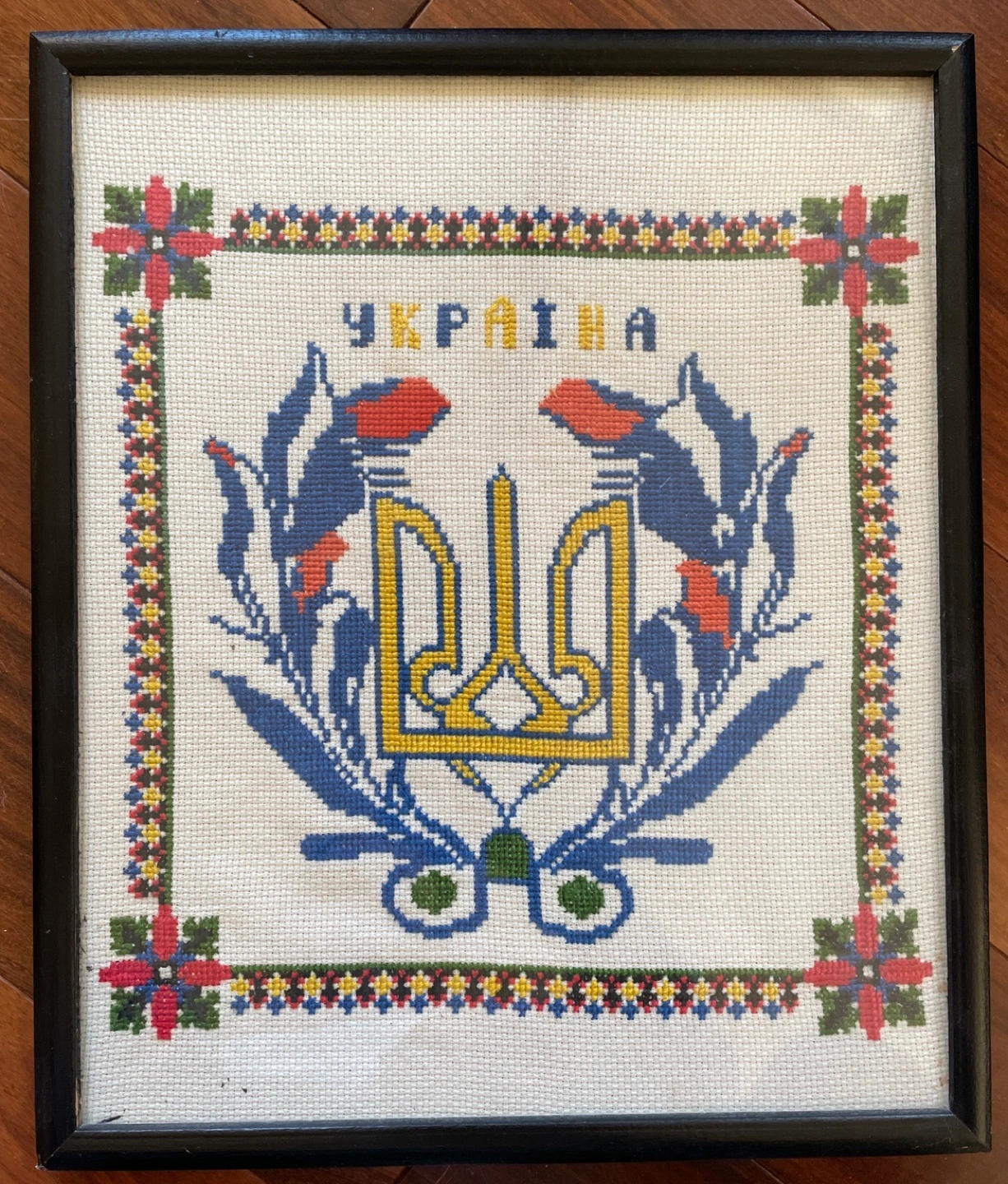 646Framed cross-stitch artwork. Features the Ukrainian coat of arms, 'Україна' embroidered in Cyrillic. Beautiful colours and detailing. Measures approximately 11 inches by 14 inches.
