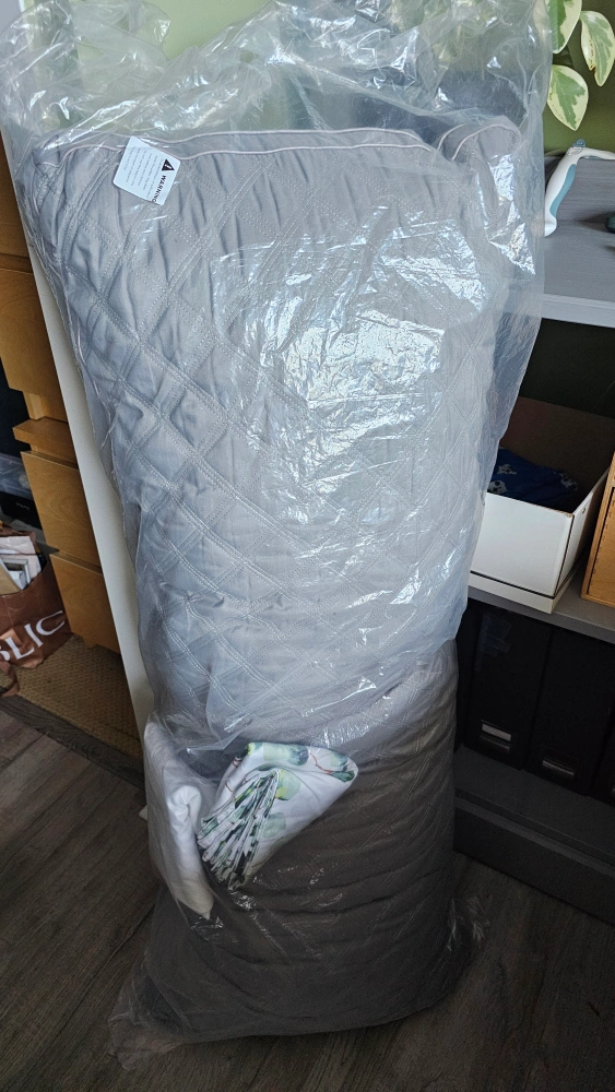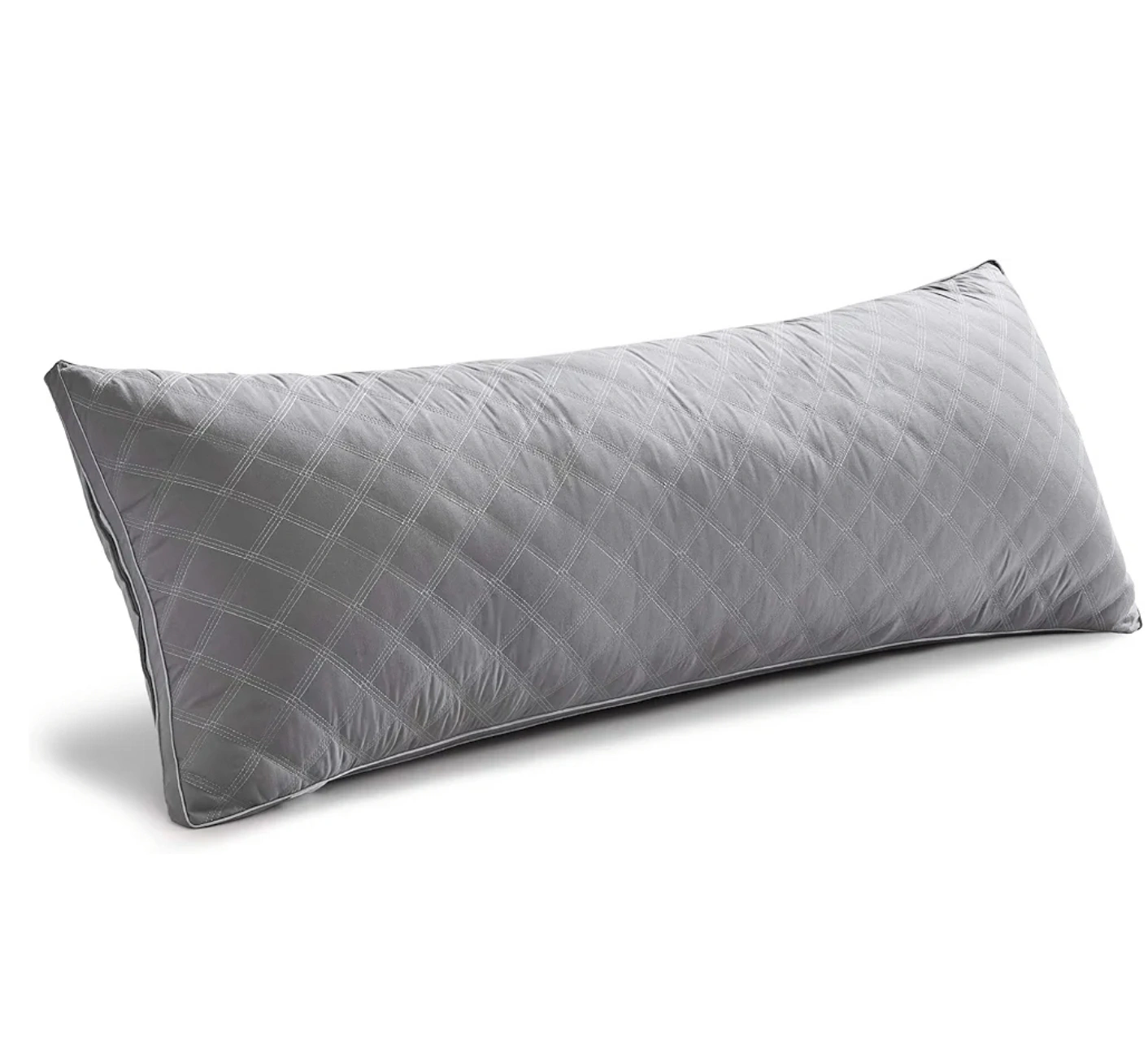 Barely used, grey quilted body pillow. Hypoallergenic and down alternative. Measures 21" x 54". Includes two pillowcases, one plain white, one with eucalyptus print. Great for head, back, and knee support.