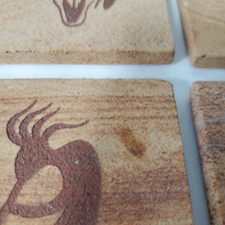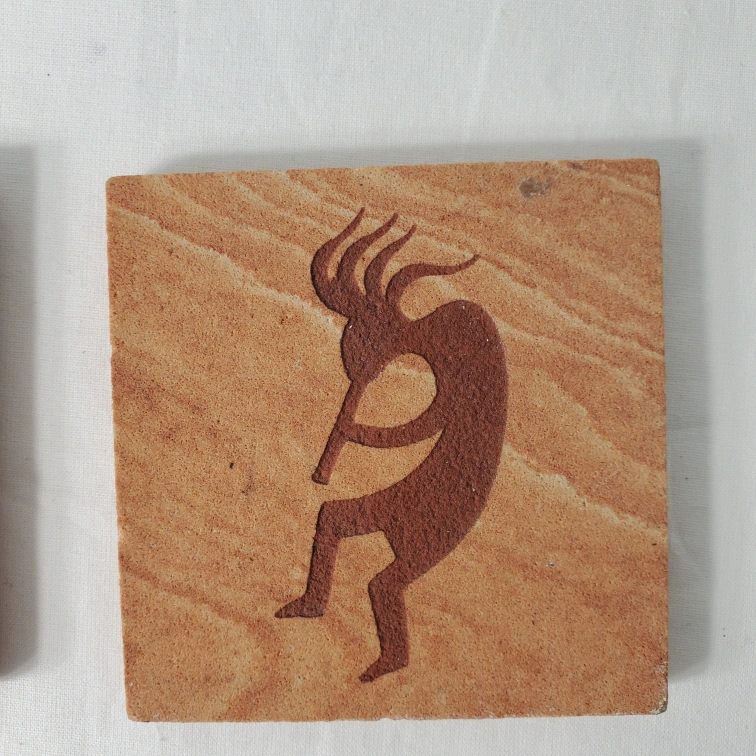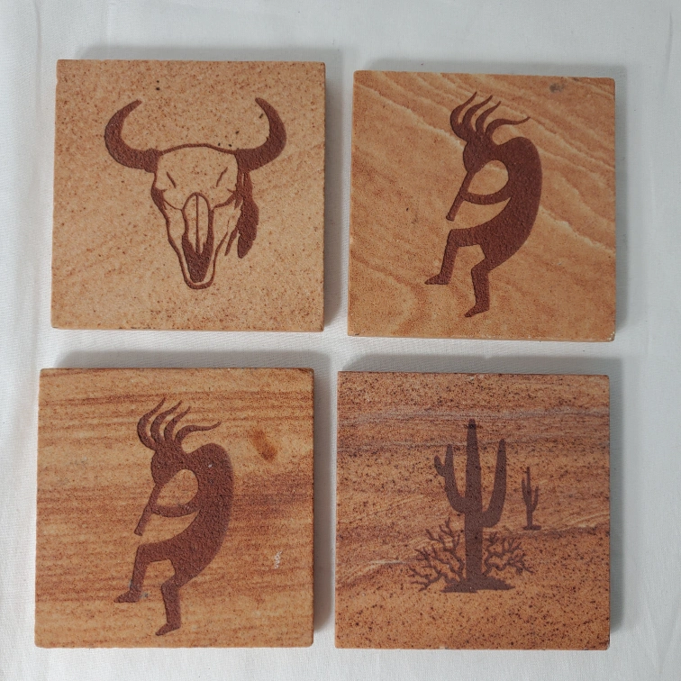 Set of four sandstone coasters. Features southwestern designs: Kokopelli, longhorn skull, and cacti. Cork backing. Square shape. Has some decent weight to the coasters. There is some Chips and marks. In over all good shape.