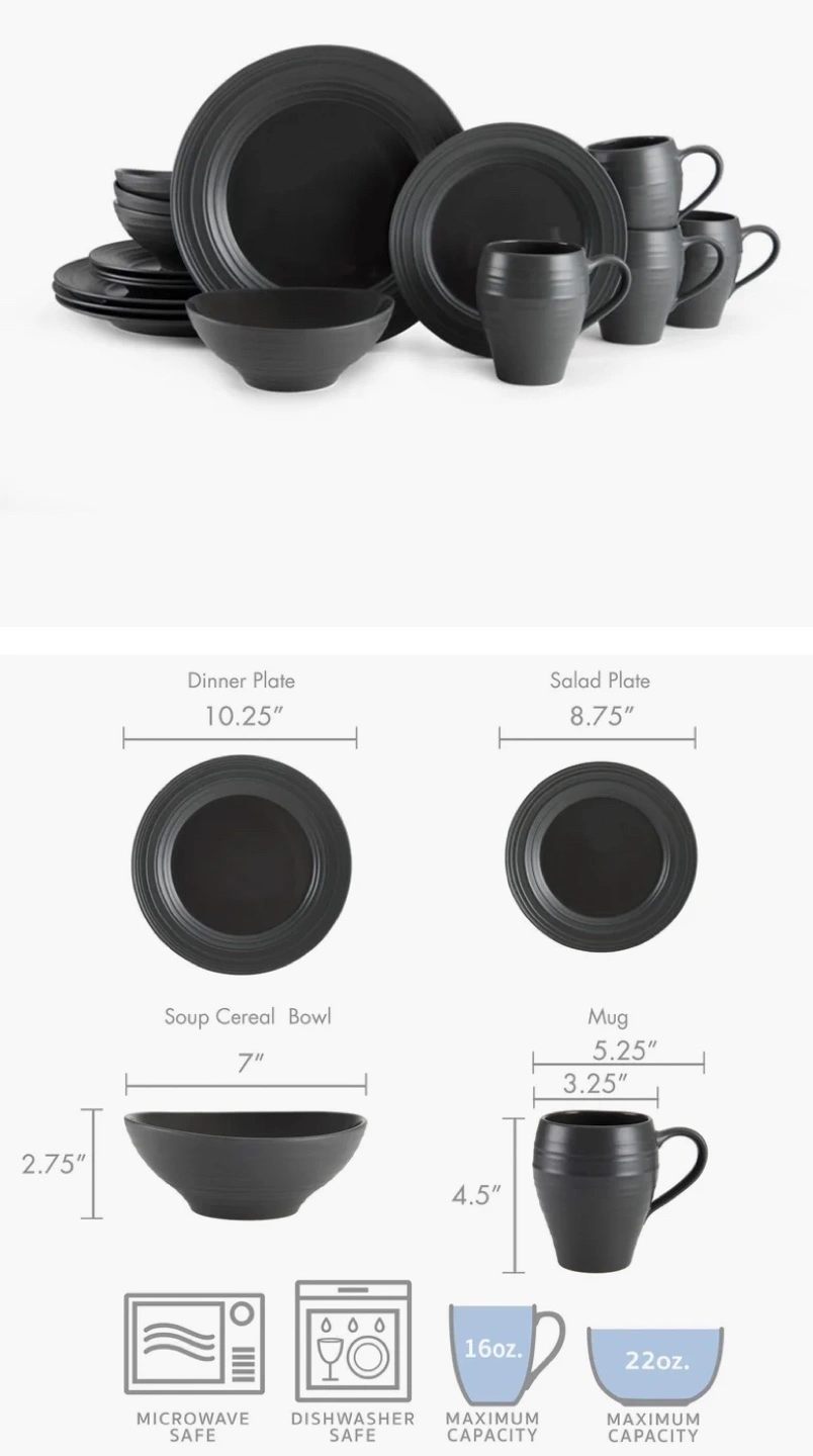 Includes an 11-1/4 inch dinner plate, 8-1/2 inch salad plate, 6-3/4 inch cereal bowl (24 ounce) and 18 ounce mug