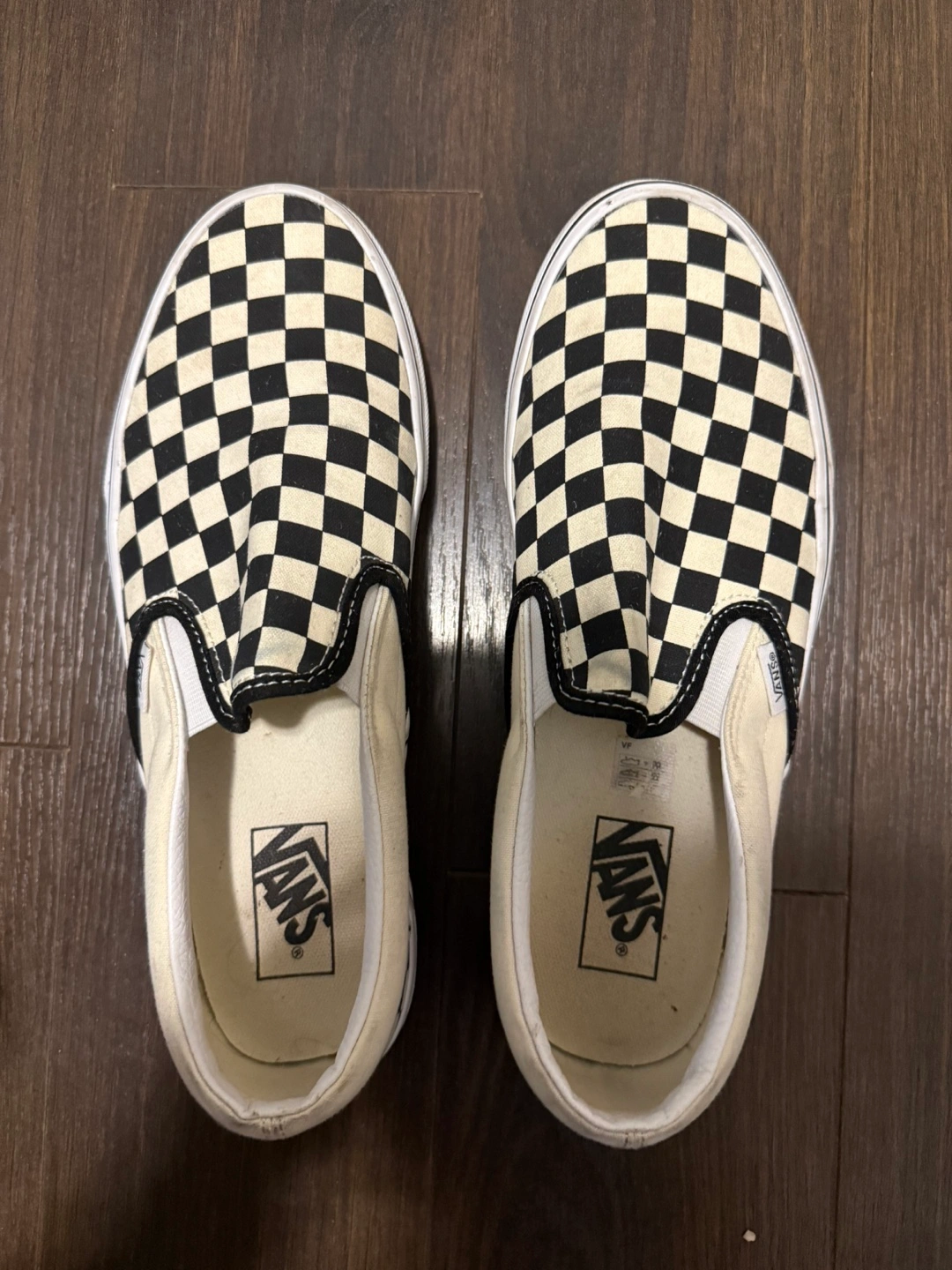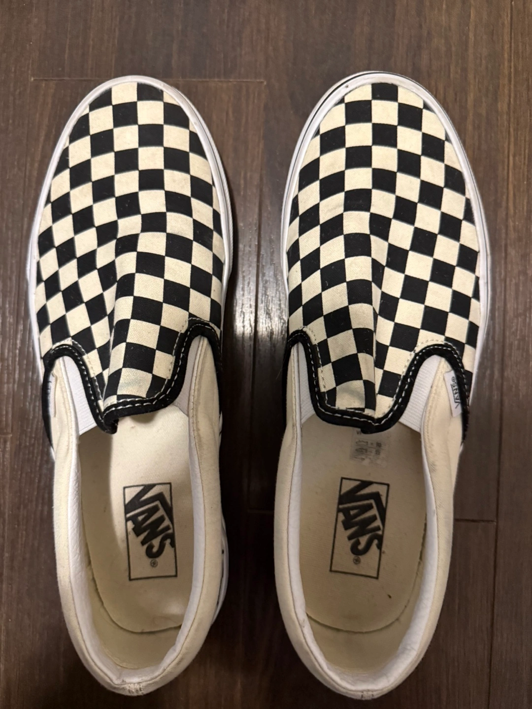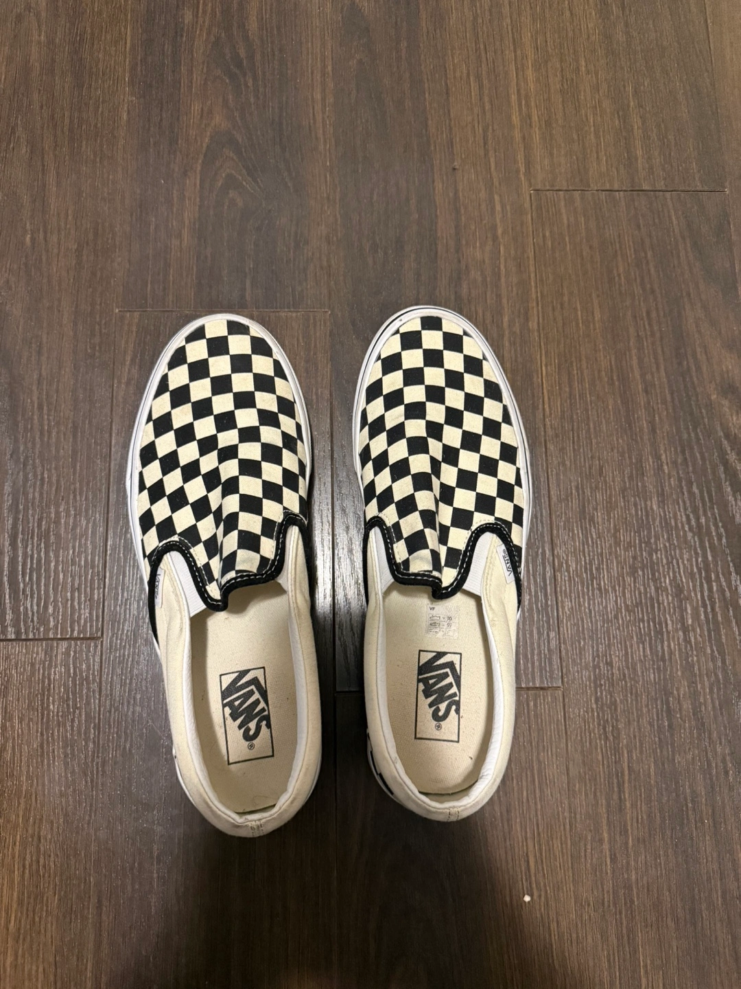 Classic Vans slip-on shoes. Checkerboard pattern. Cream and black colourway. Pre-owned.