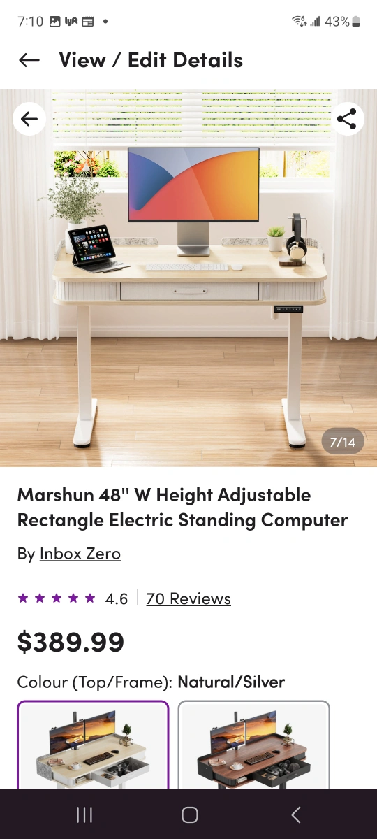 Height adjustable standing desk. Natural/Silver colour. Electric lift mechanism. Large work surface. Includes drawer. Supports up to 176 lbs.