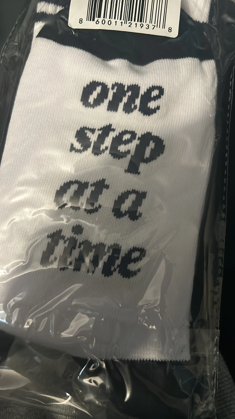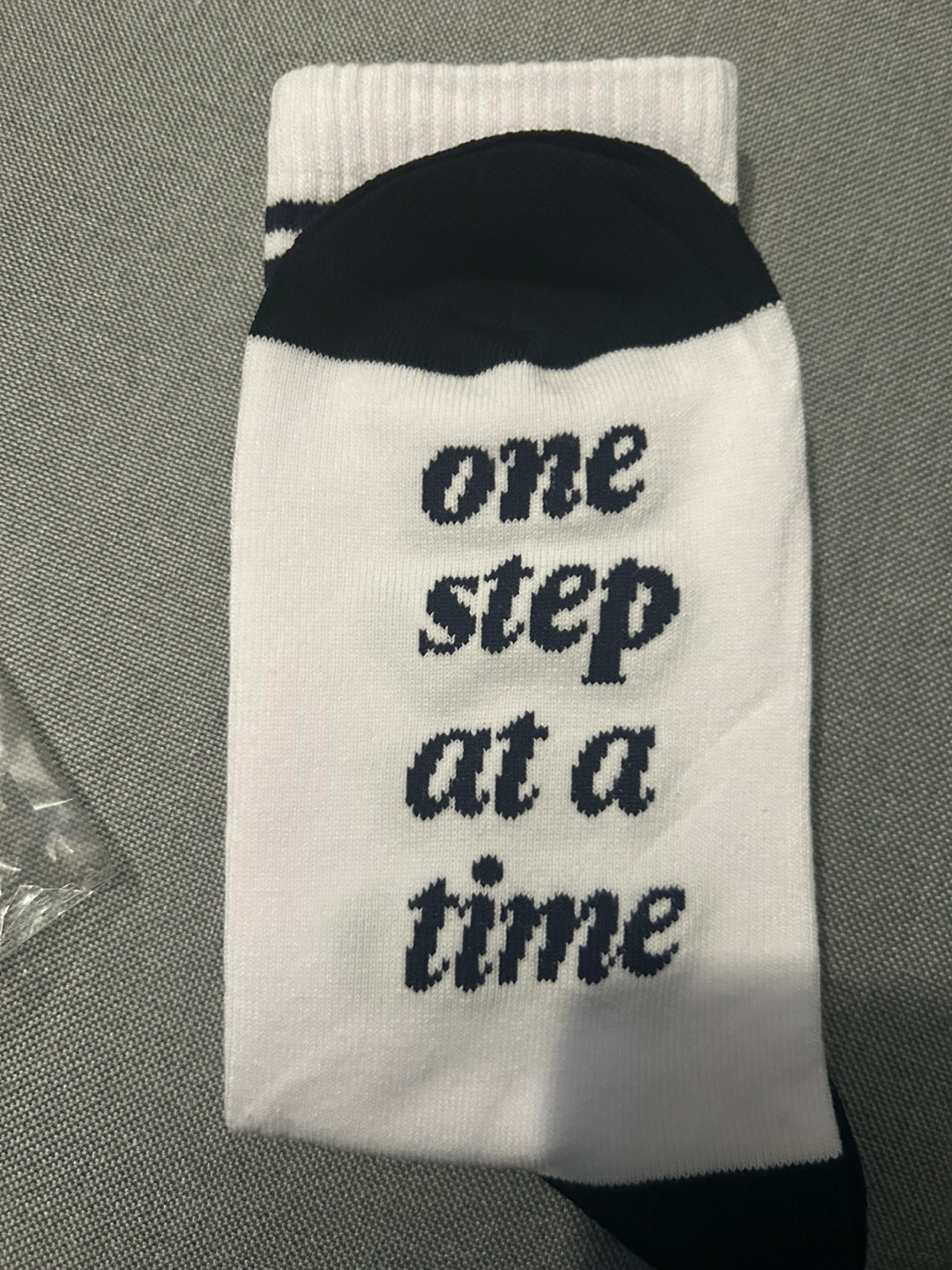 New white crew socks. Navy blue lettering reads 'one step at a time'. Navy blue cuffs and toe.