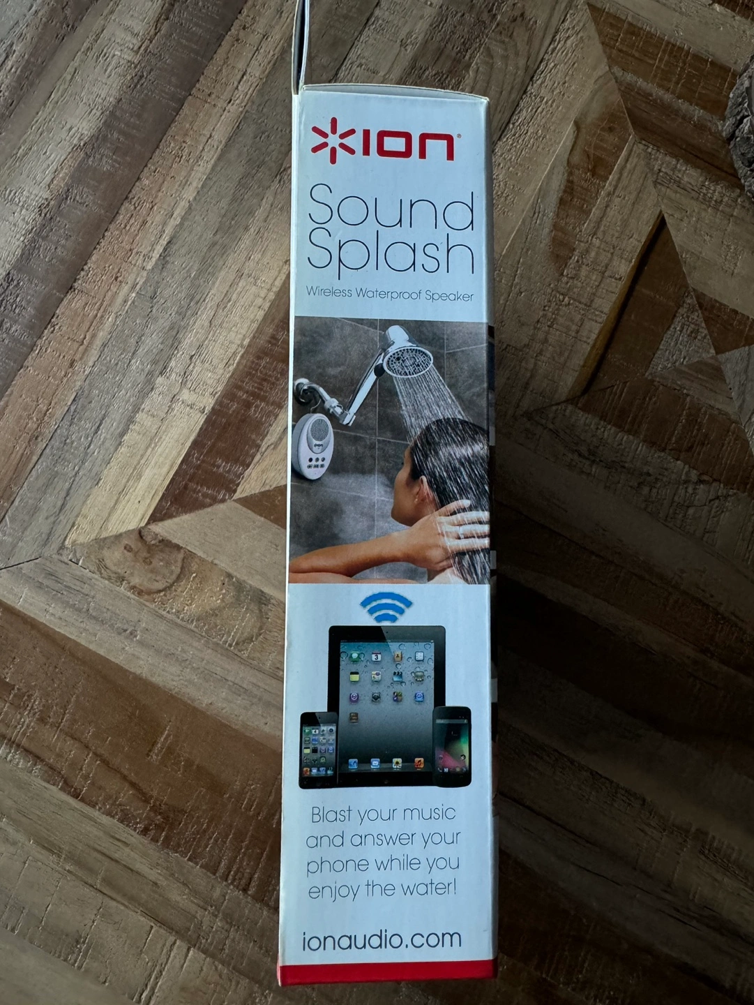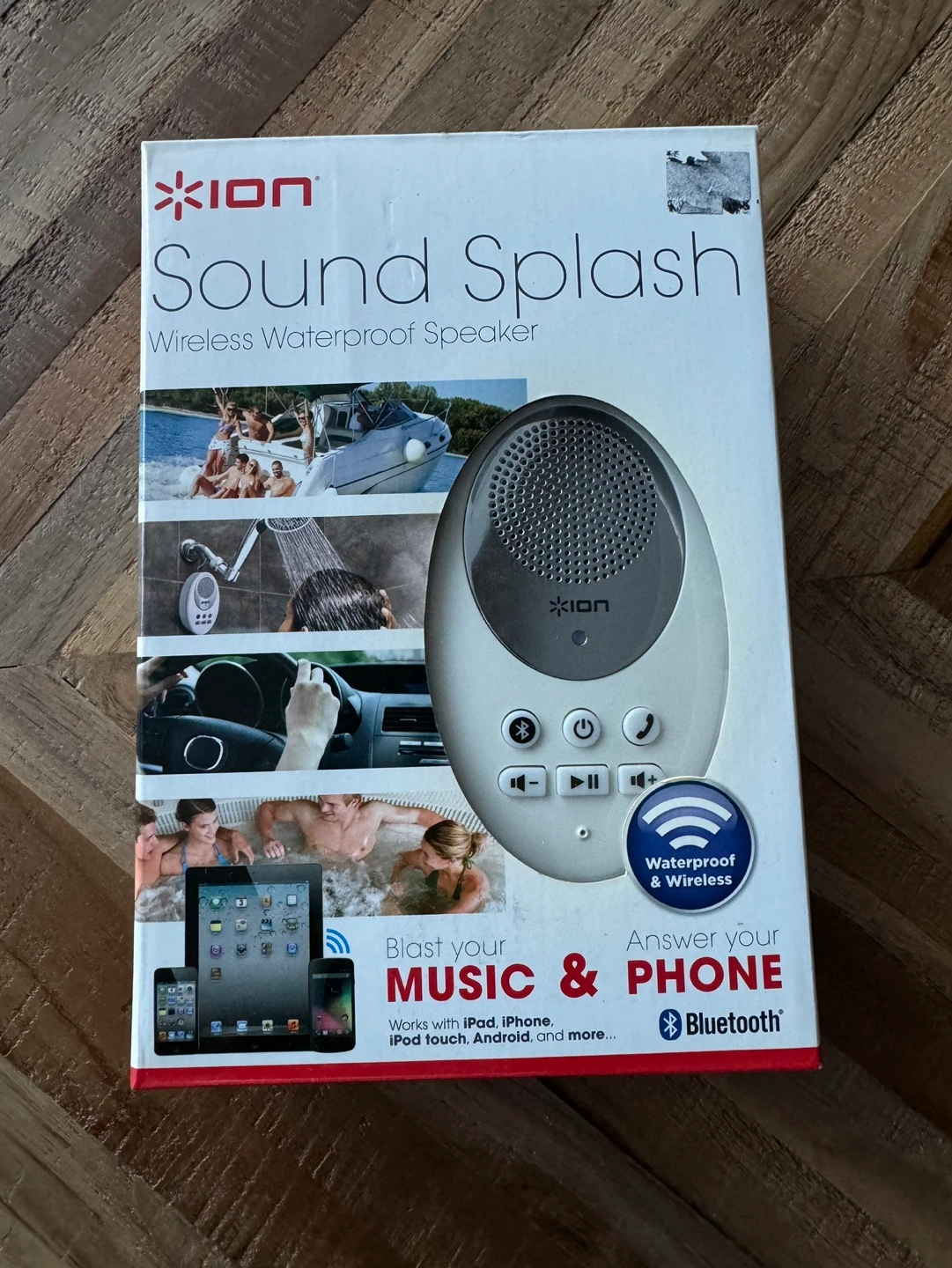 Wireless waterproof Bluetooth speaker. Works with iPhone, iPad, Android. Answers phone calls. Includes suction cups for mounting. New in box.