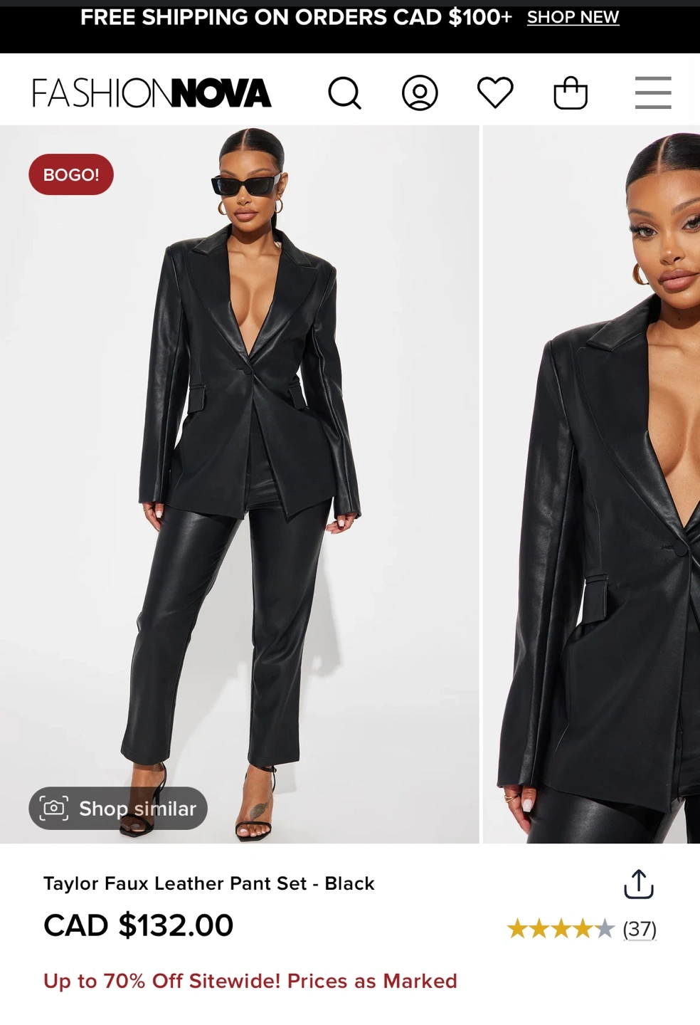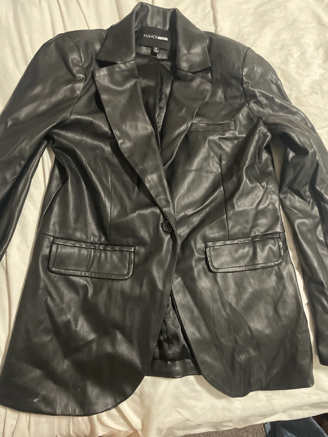 Black faux leather blazer. Single button closure. Classic style. Great for work or a night out. A bit wrinkly but just needs to be steamed