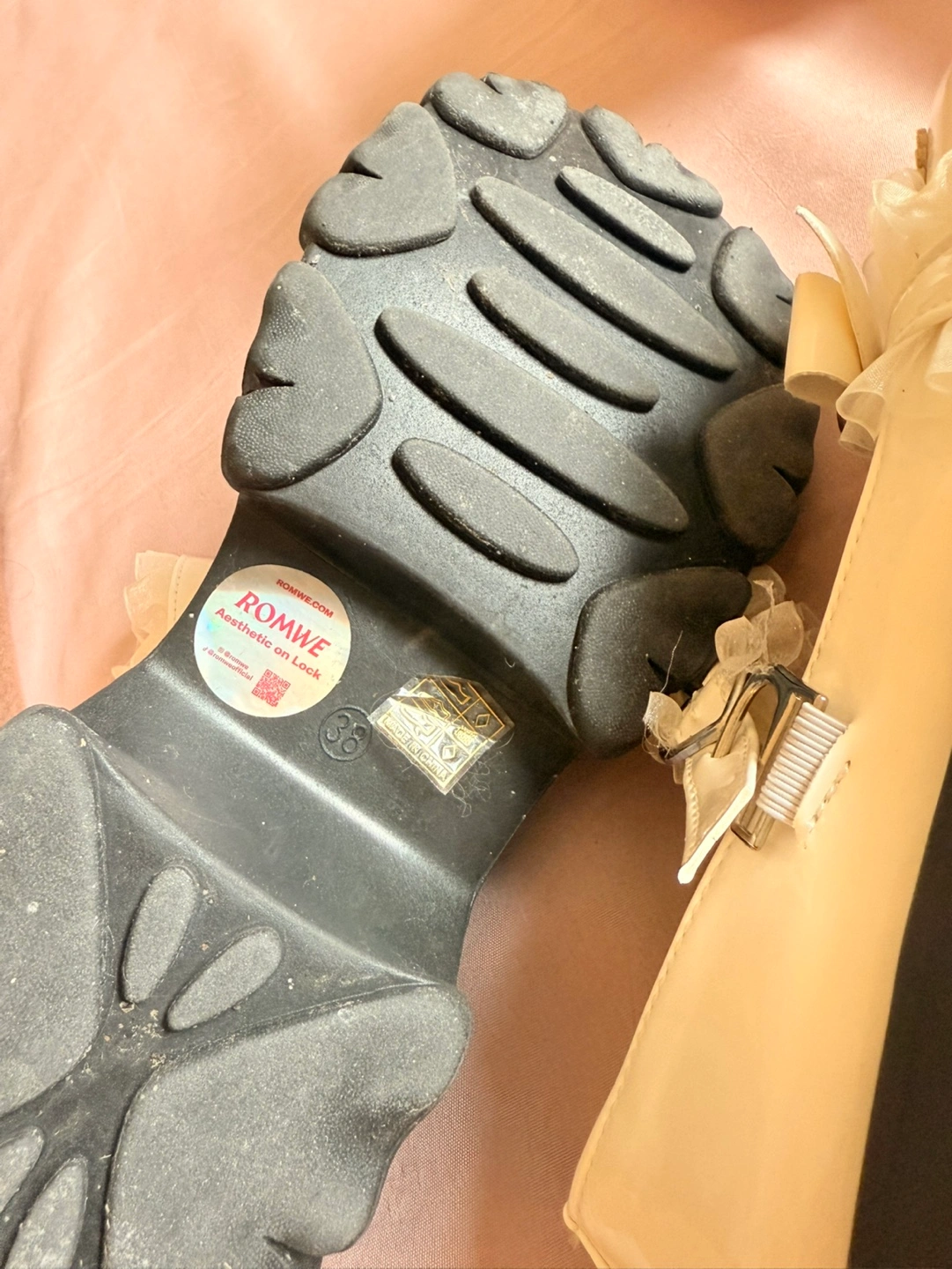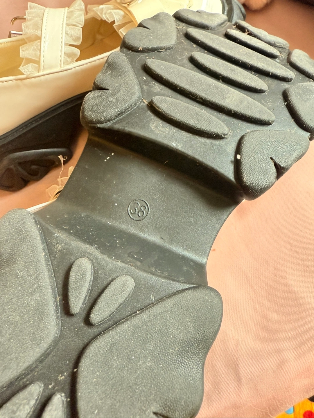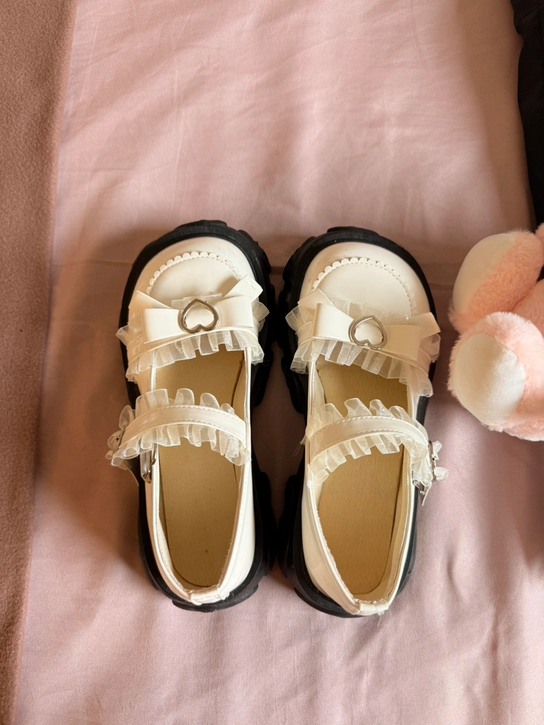Adorable platform Mary Jane shoes. White patent leather upper with black chunky sole. Features a sweet bow and lace detailing. Size 38. $5