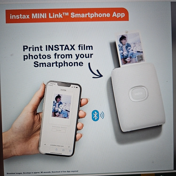 Portable photo printer. Prints Instax film photos from your smartphone. Bluetooth enabled. Requires app download.