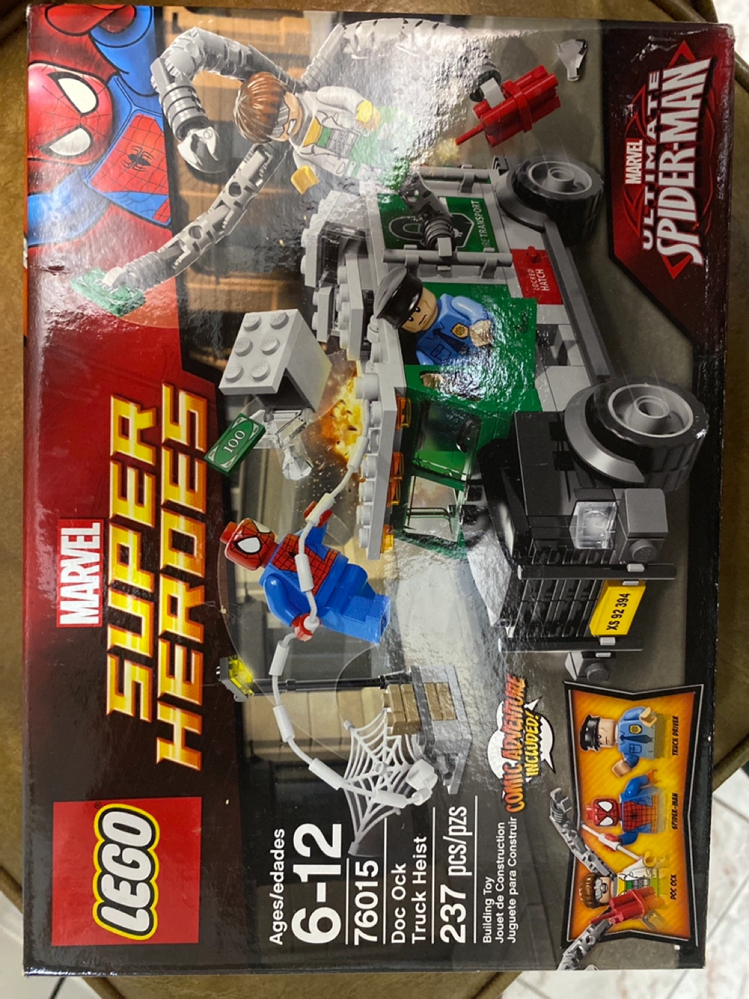 LEGO set, ages 6-12, 237 pieces. Includes Doc Ock, Spider-Man, and other minifigures. Features a truck and other accessories.