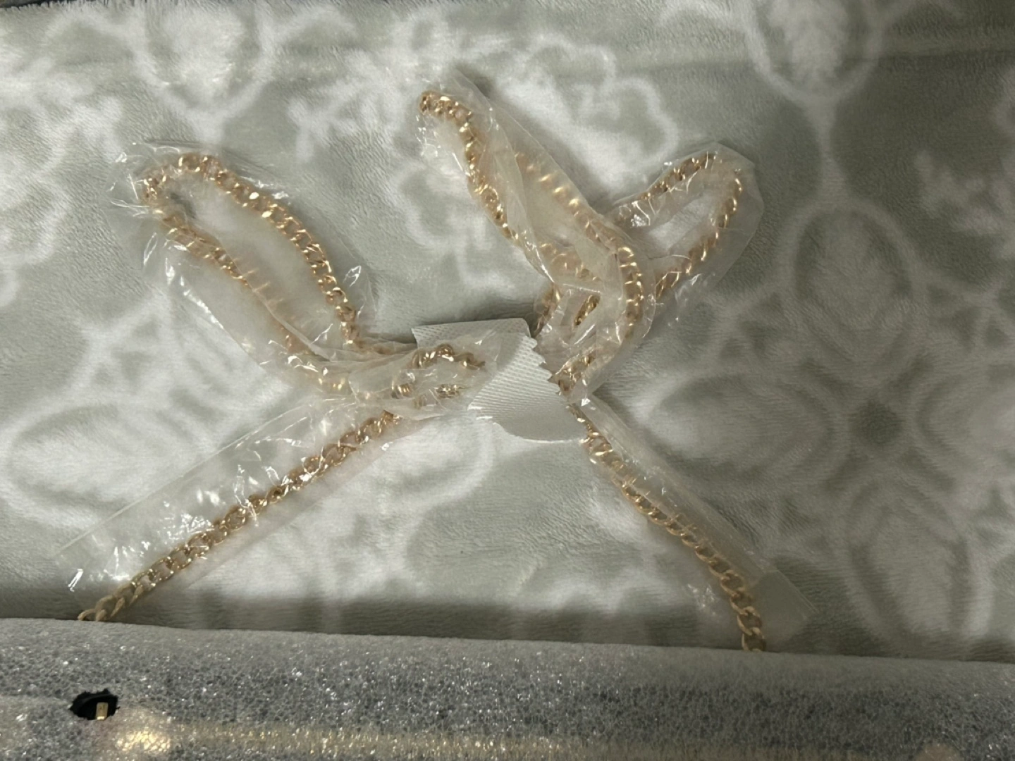 Black leatherette envelope clutch. Gold-tone hardware. Features a gold heart logo. Detachable gold chain strap. Dust bag included.