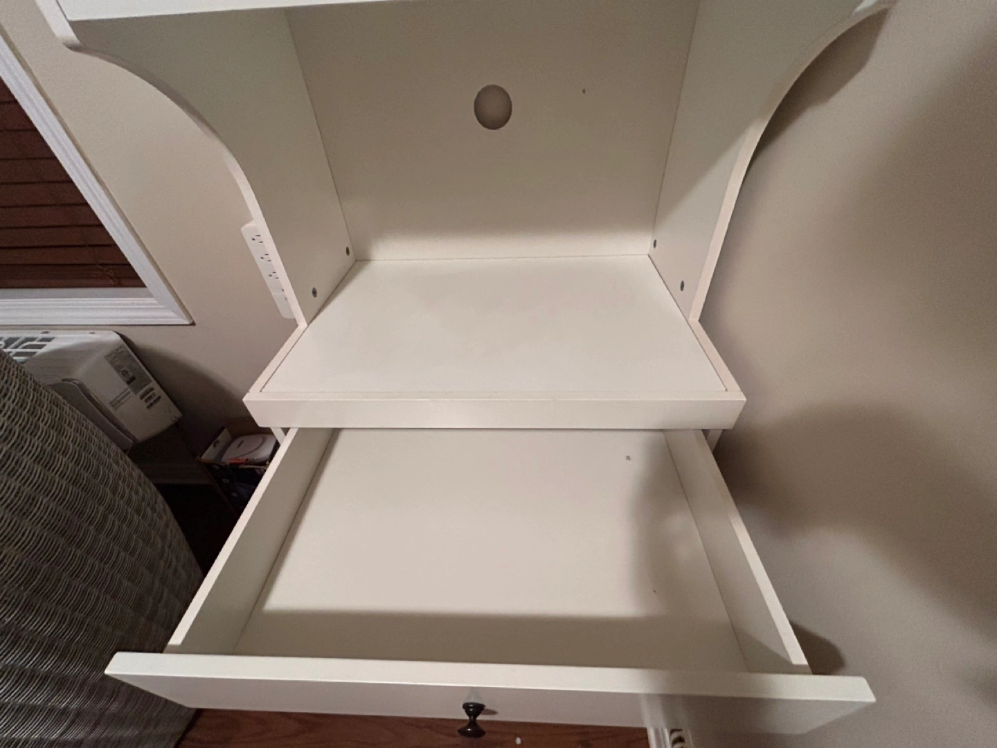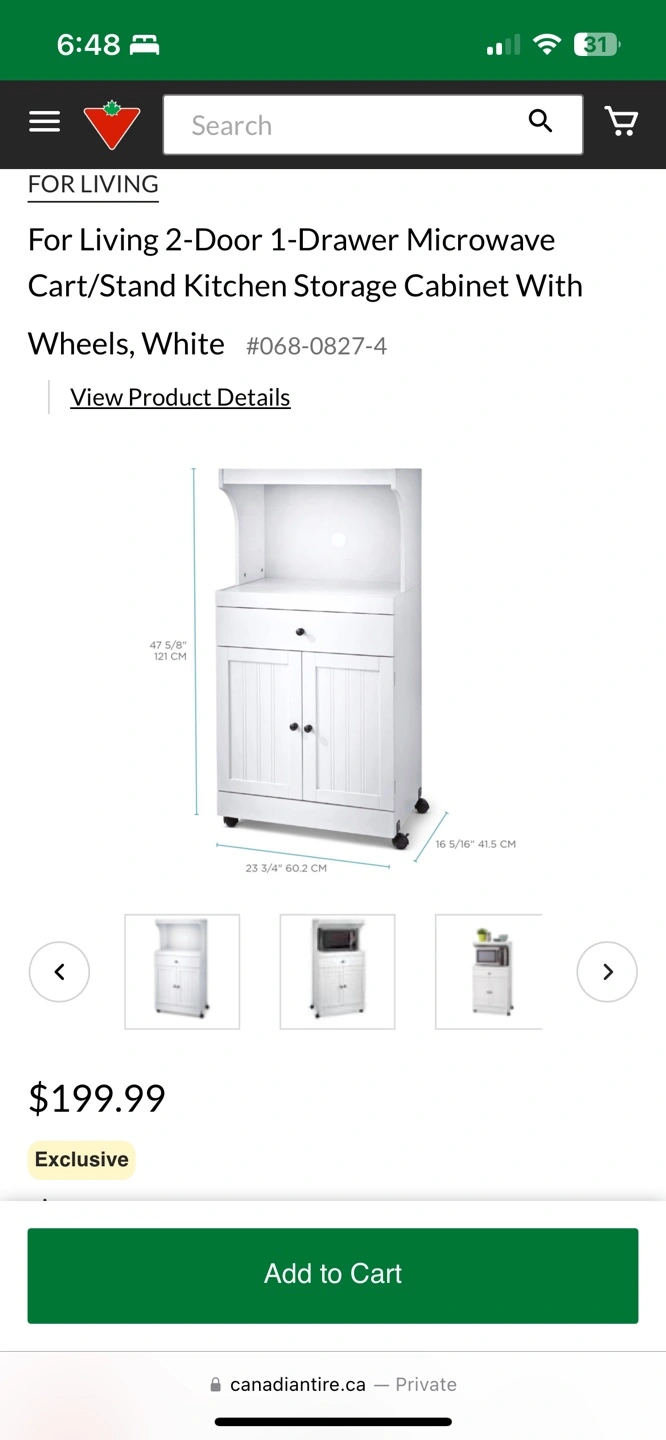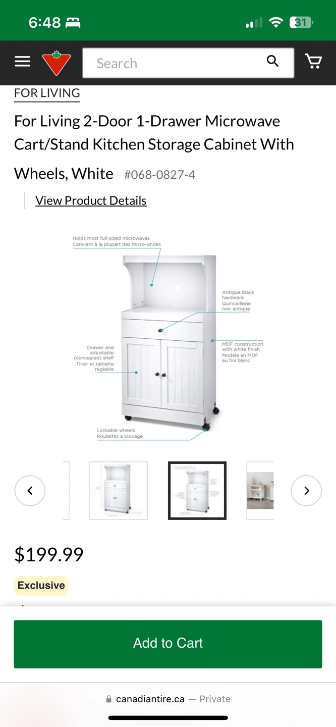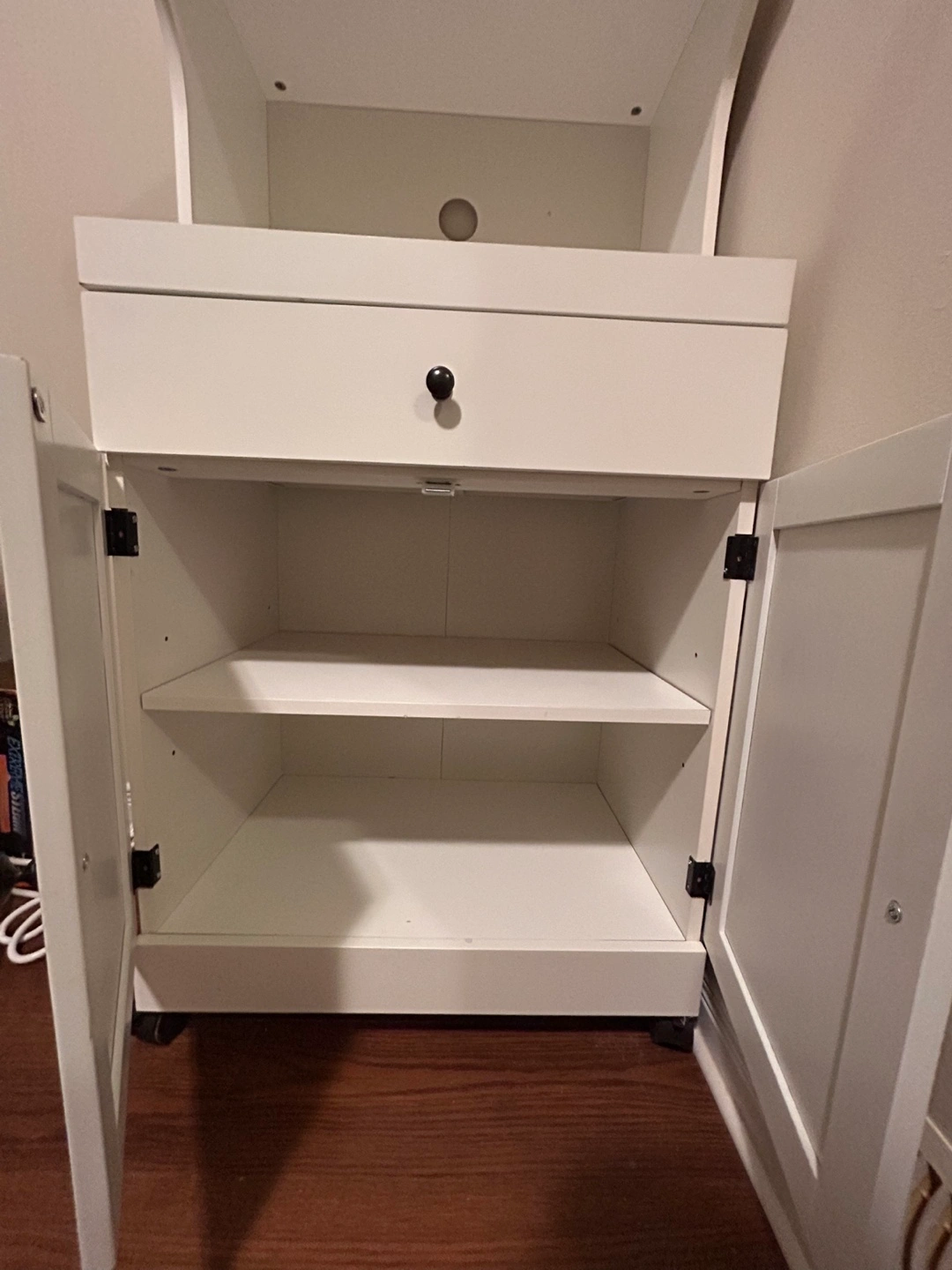 White kitchen storage cabinet with wheels. Two doors, one drawer. Holds most full-sized microwaves. Lockable wheels. Antique black hardware.