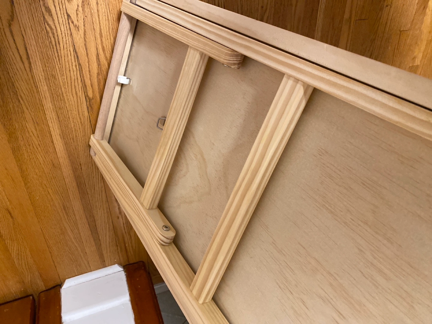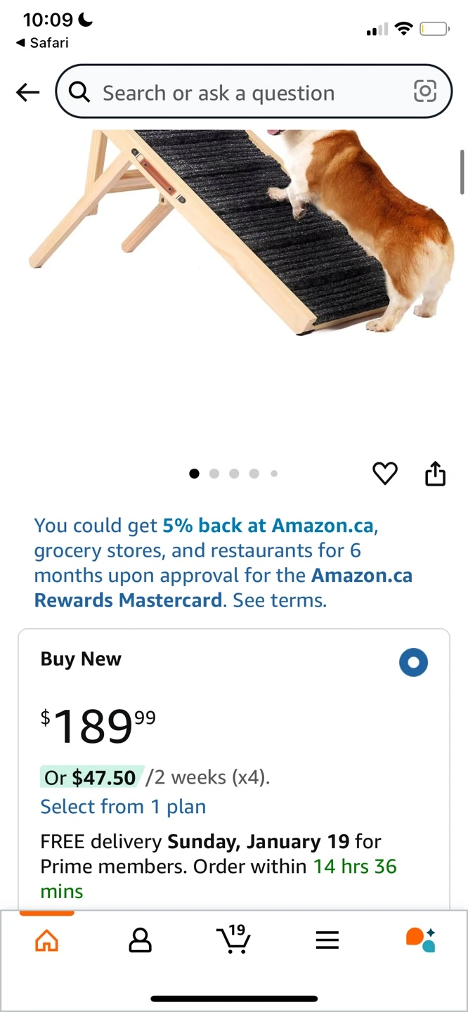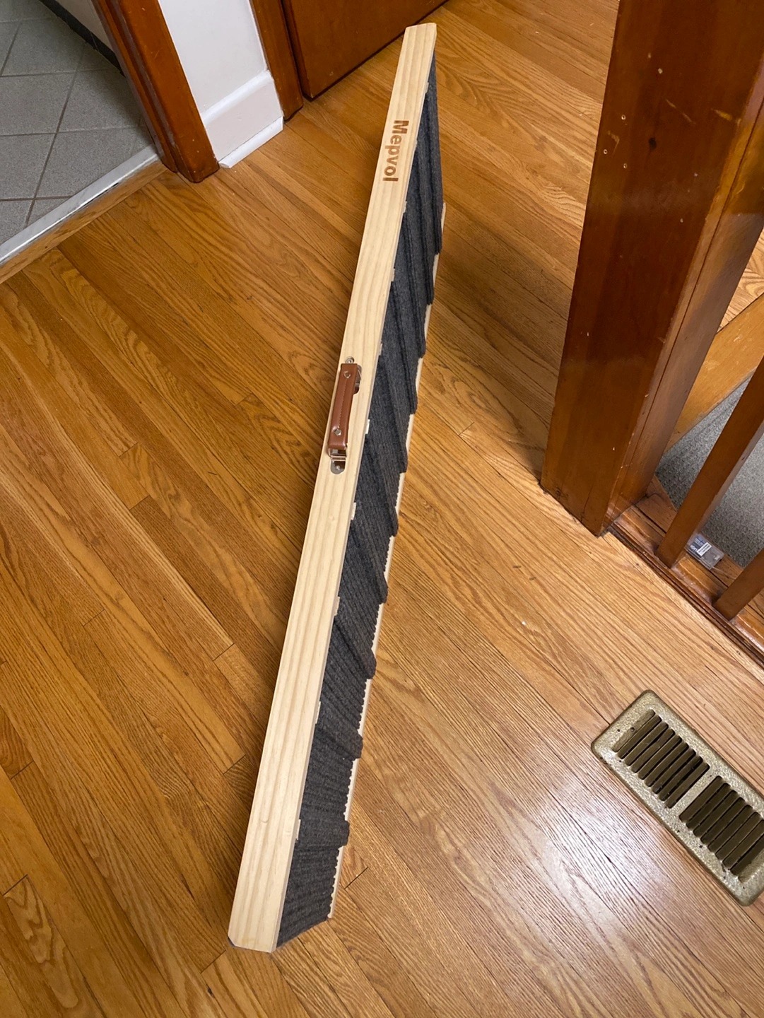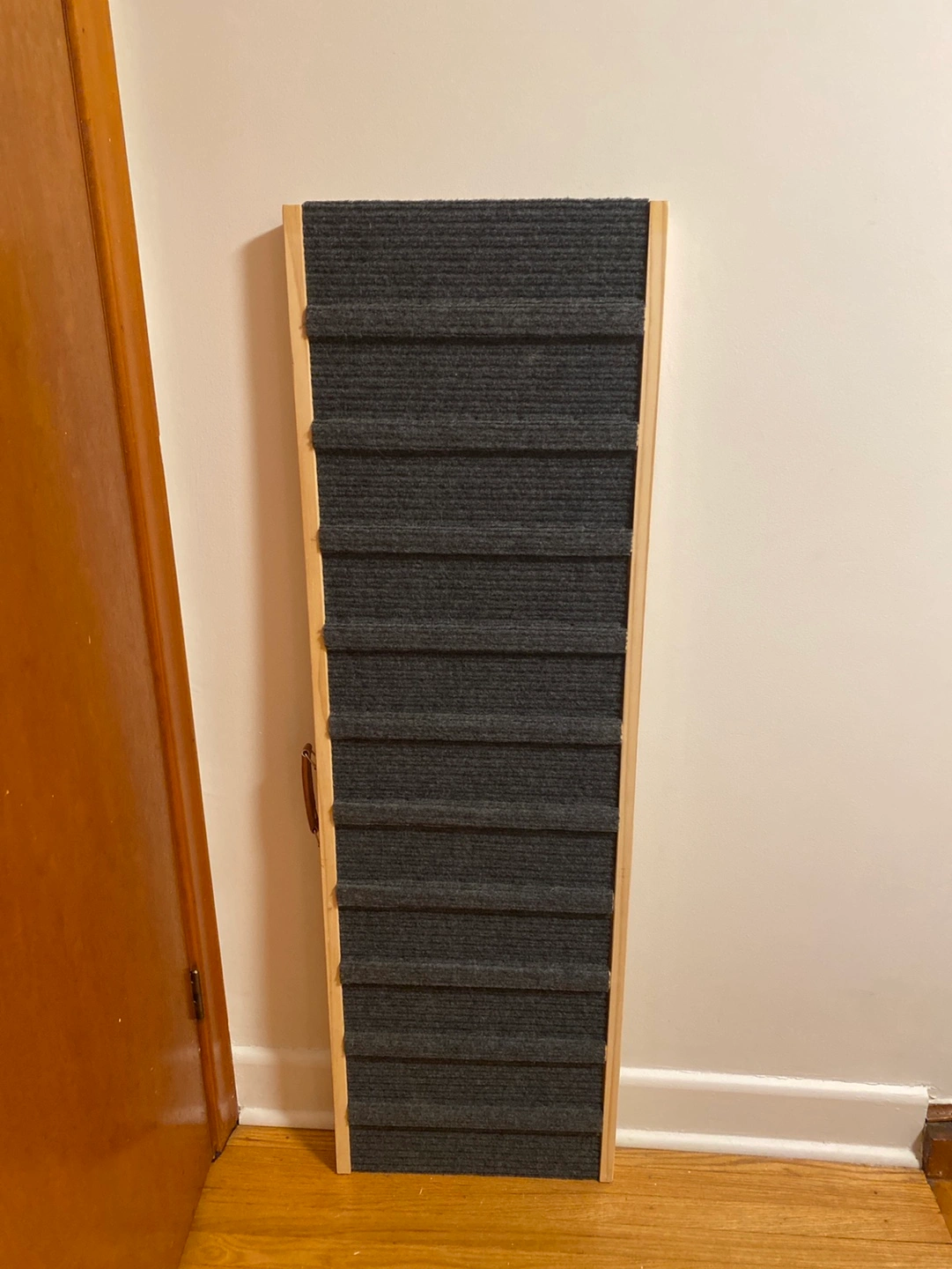 Wooden pet ramp for small or large dogs. Features 8 steps and a gentler slope. 43.3" long. Grey carpet surface. Easy to fold and store. Includes a carrying handle. Bought for 200 total.