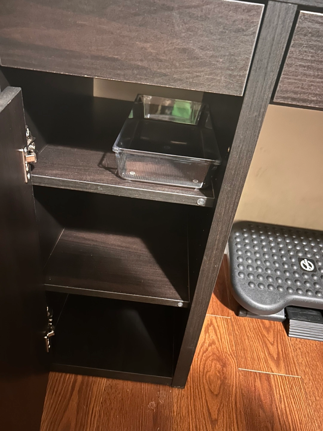 Functional writing/ computer desk. Features a drawer, cabinet with shelves, and a drawer. Great for home office or student use.