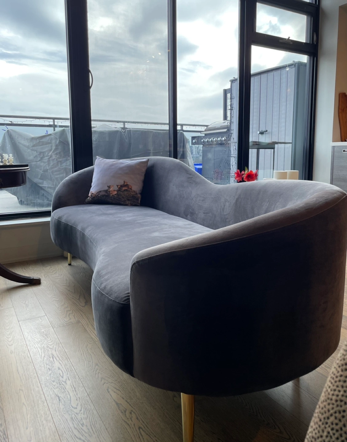 Stylish curved sofa, light grey velvet upholstery. Gold legs. (Removable for transportation) Unique design, adds character to any living space. Comfortable seating. Just a few months old from Wayfair paid $1900. No stains nor scratches. Pet free.