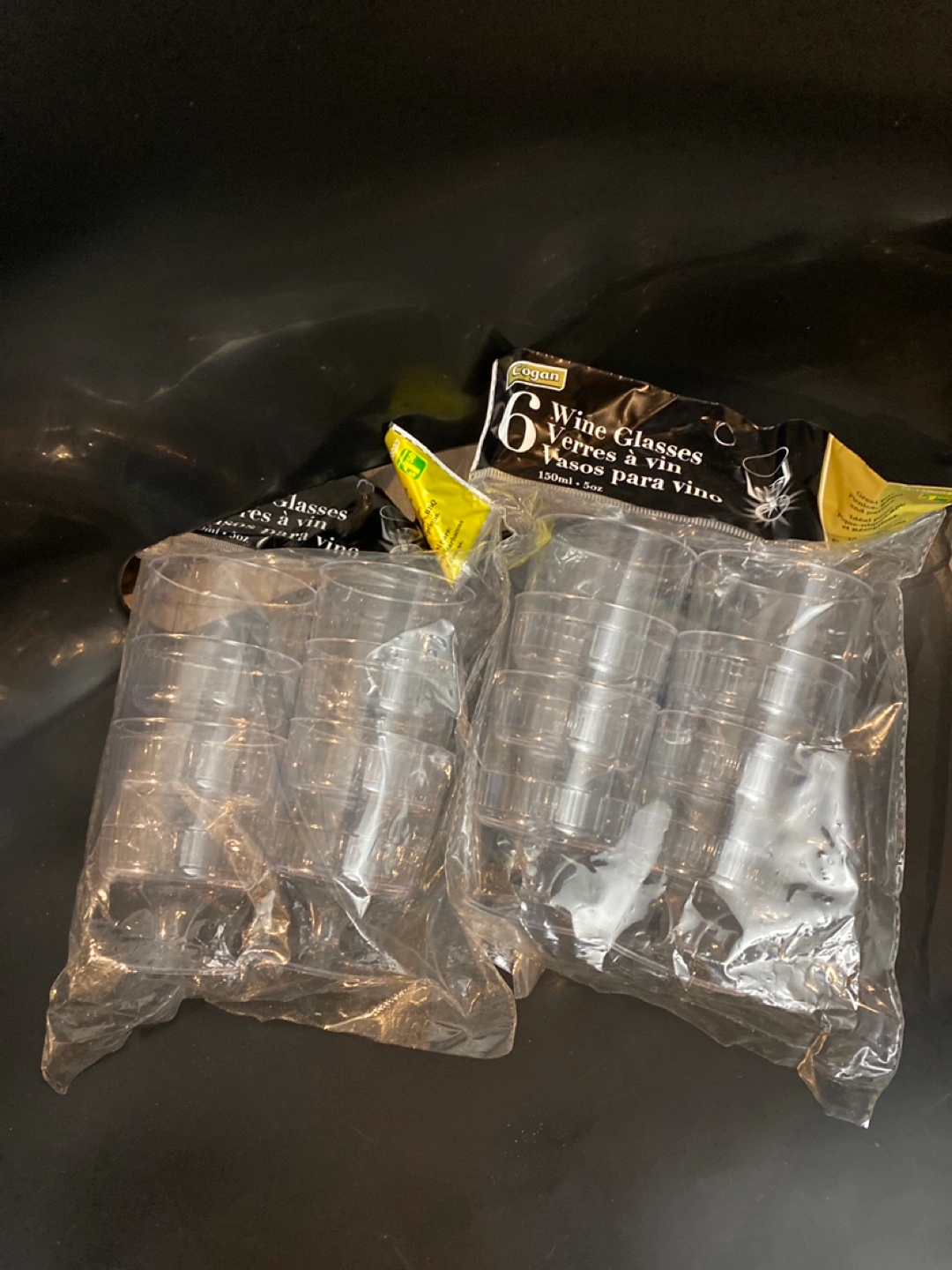 335Two packages of six 150ml plastic wine glasses. Clear plastic. New in packaging. Cash pick up only.
