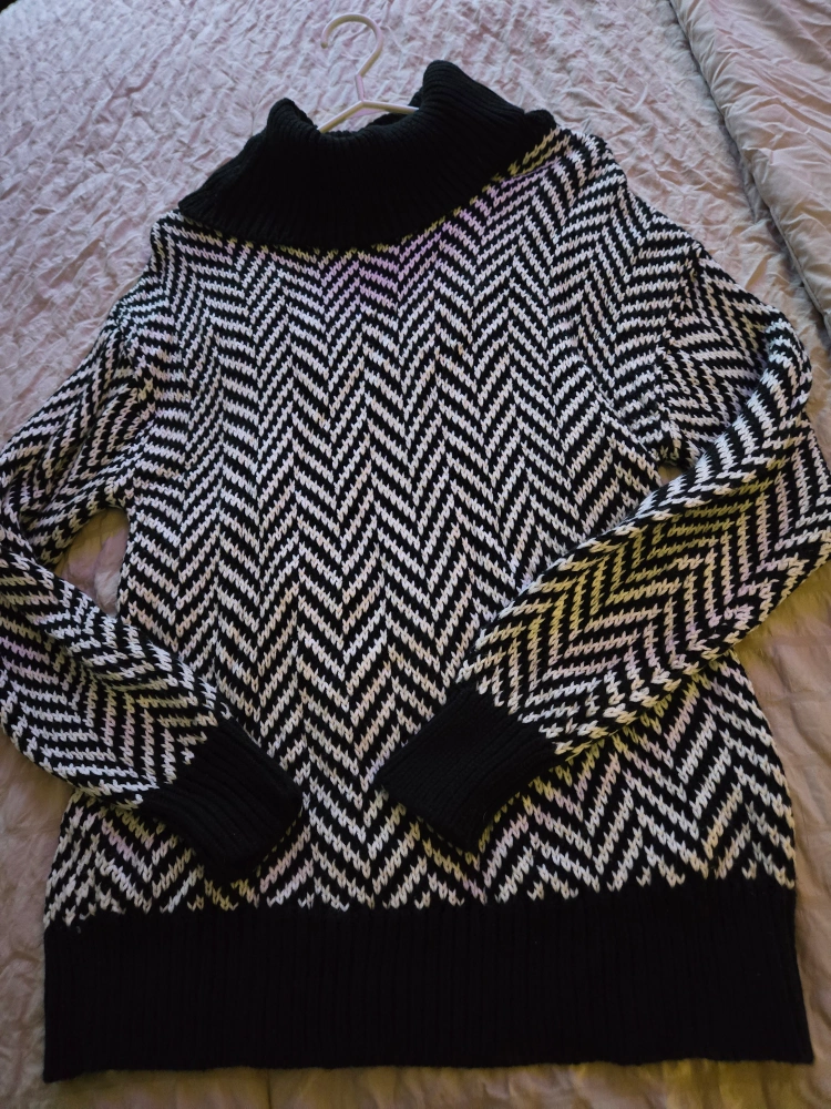Black & white sweater. very warm. Never worn. I bought it. But it doesn't feel loose enough for me. Enjoy