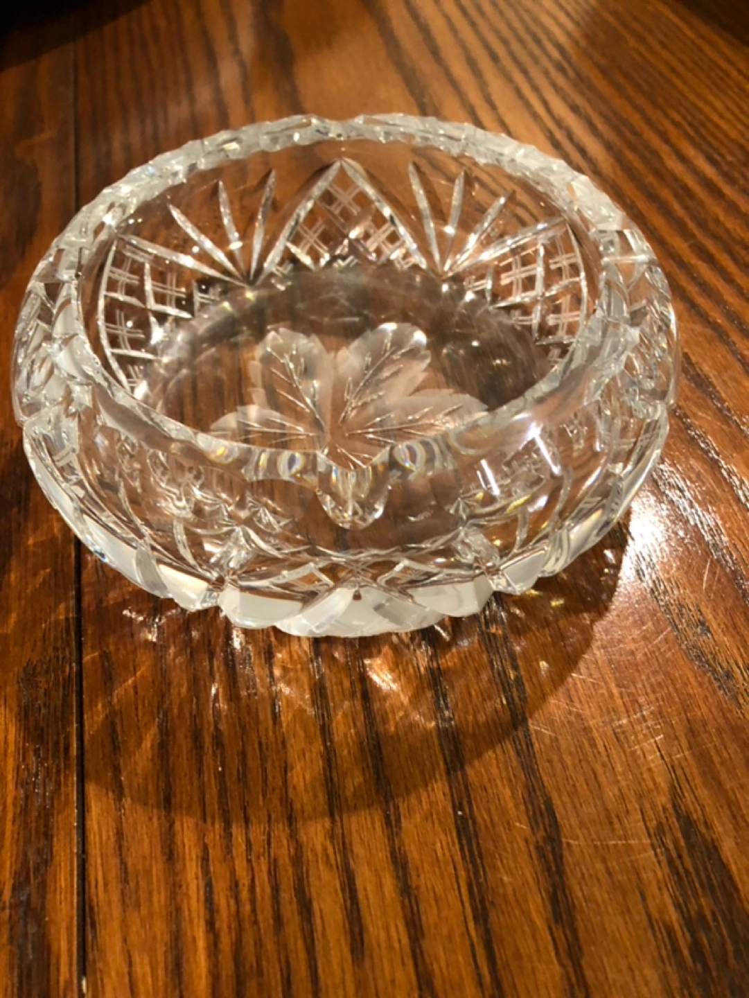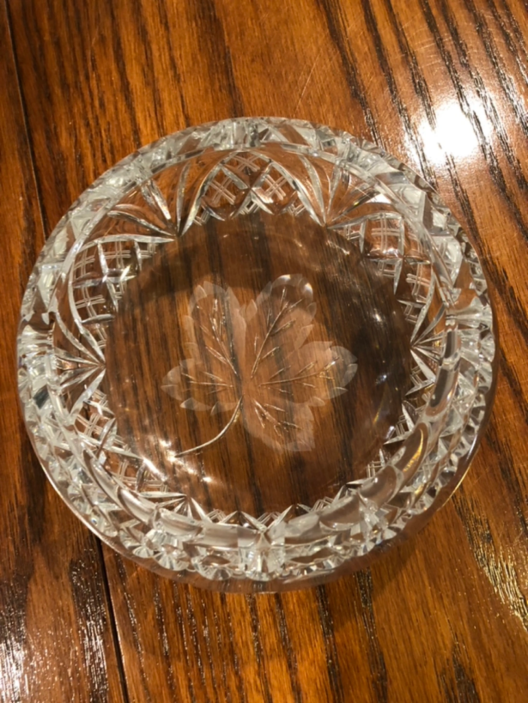 Large round crystal ashtray. Etched leaf design in the centre. Cut glass detailing around the edges. Perfect for a vintage collection.
