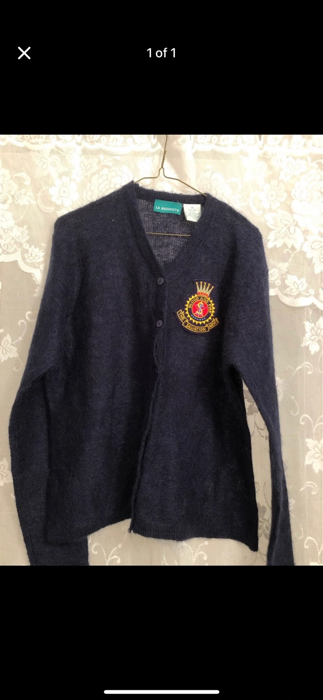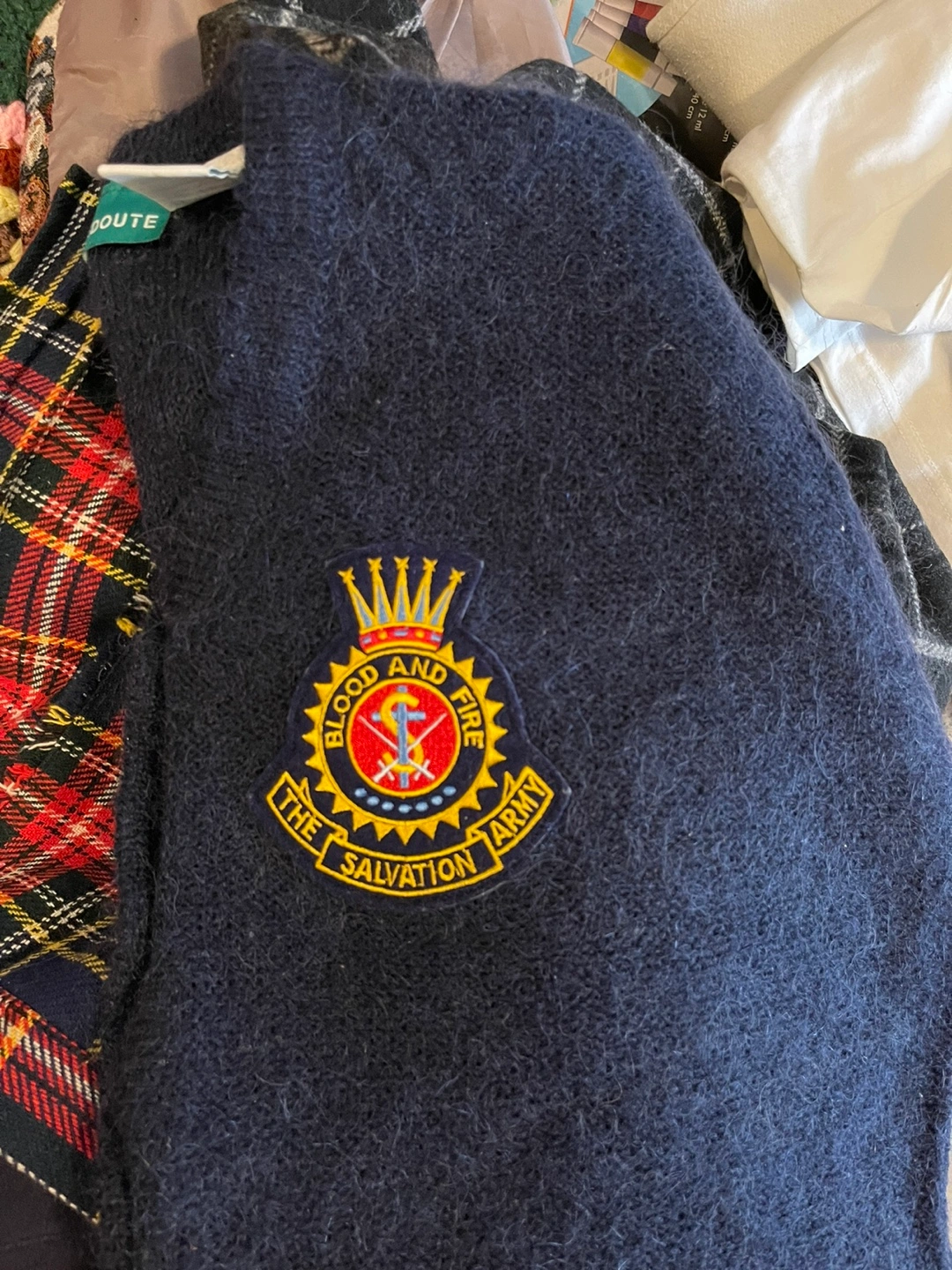 Navy blue wool cardigan. Features an embroidered Salvation Army crest. Button front. Long sleeves.