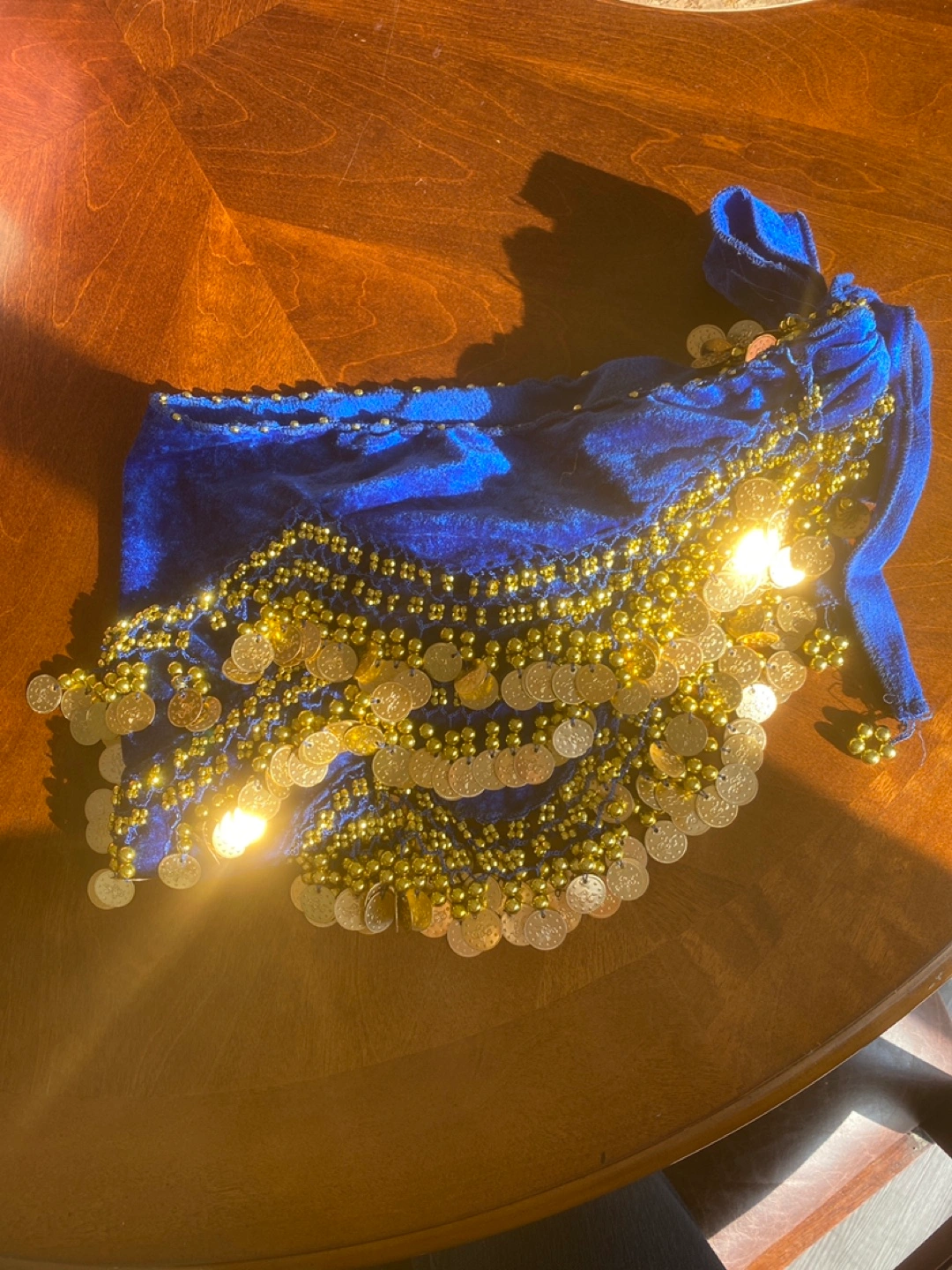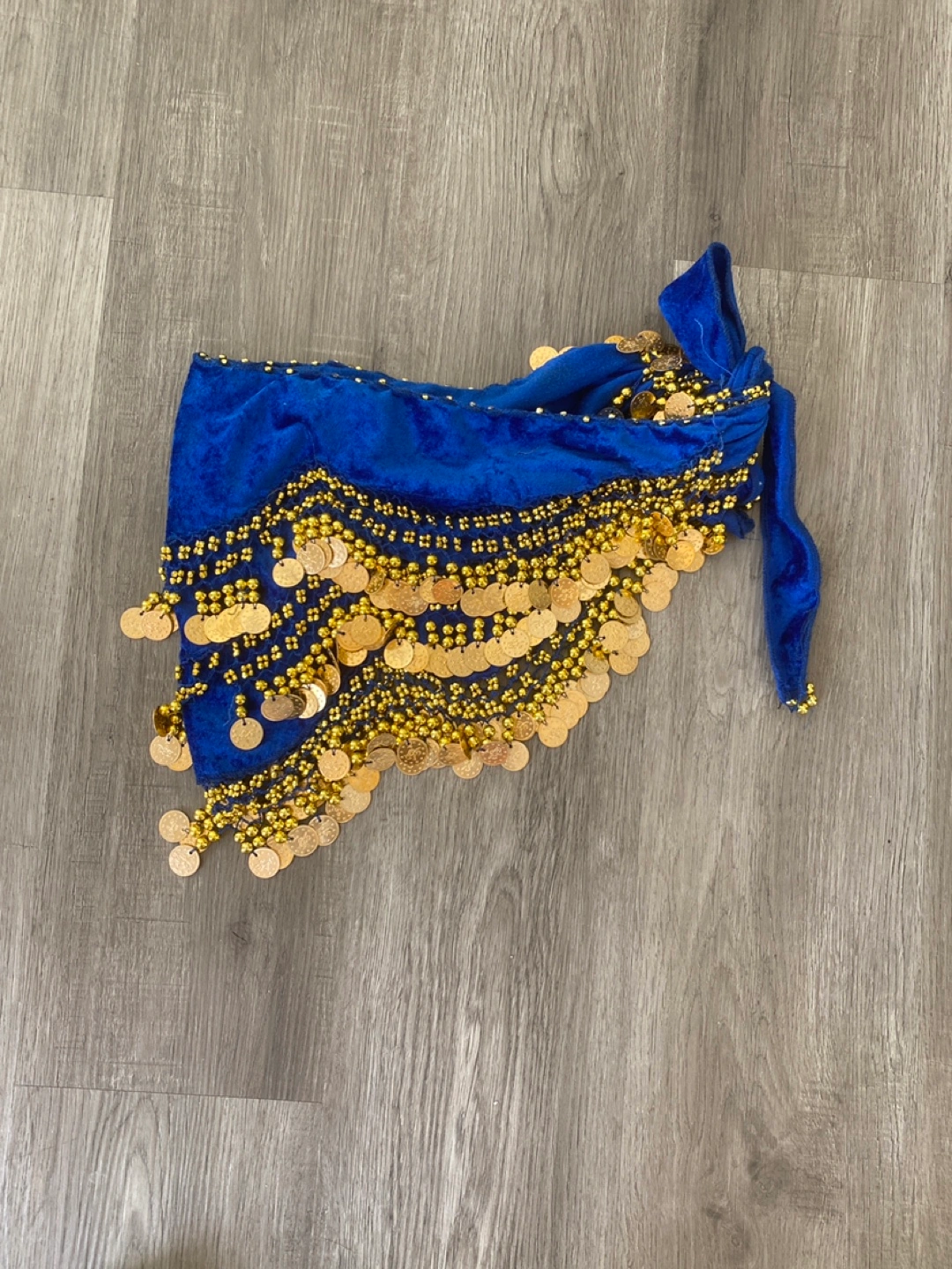 Beautiful blue velvet hip scarf. Features gold coin accents. Great for belly dancing or costume. One size.