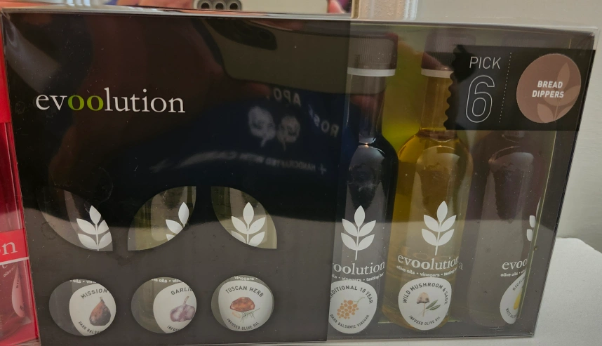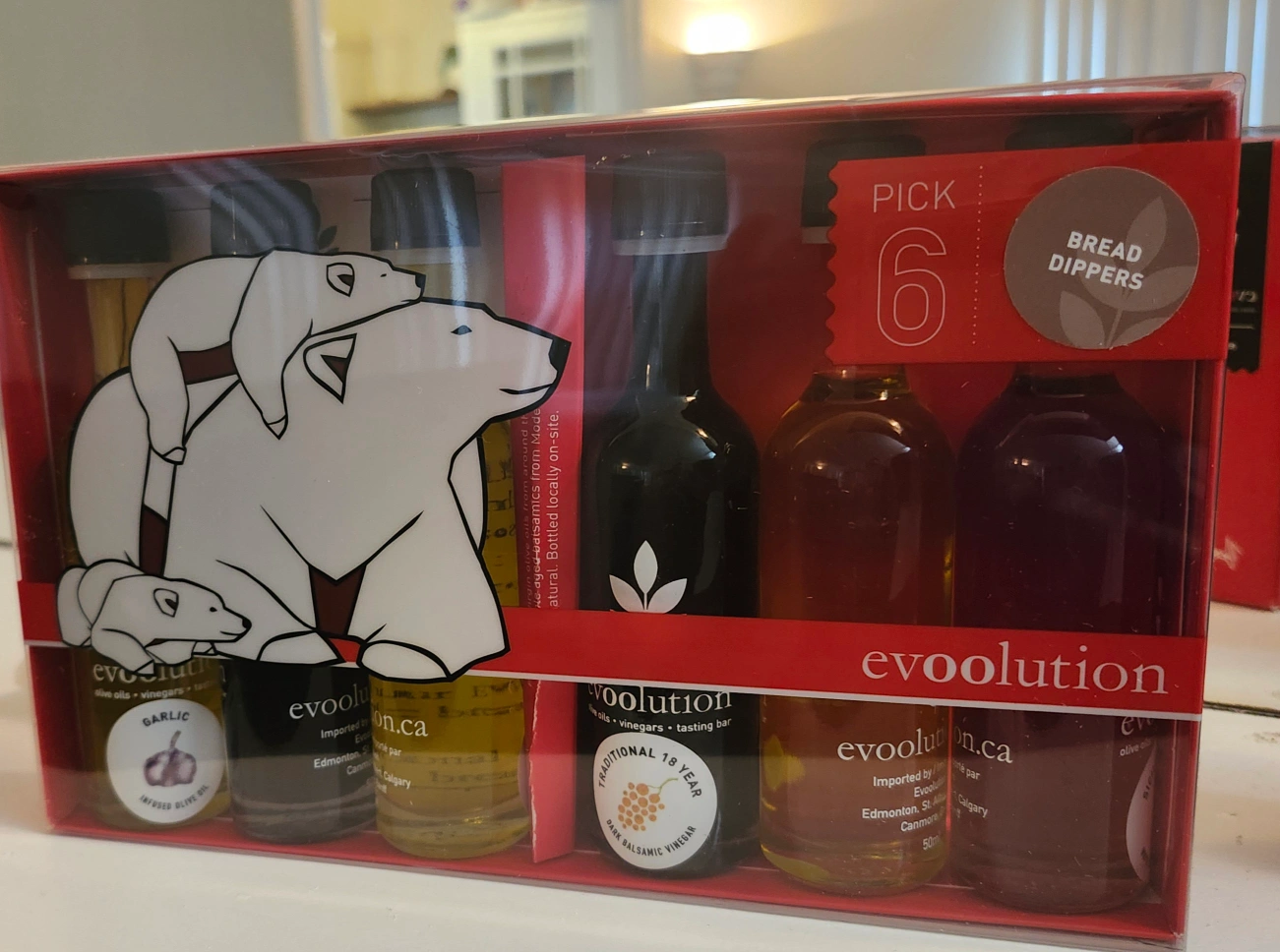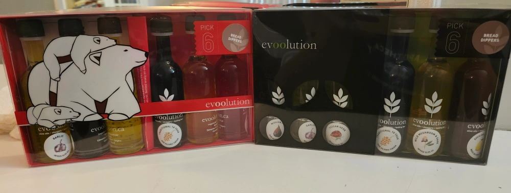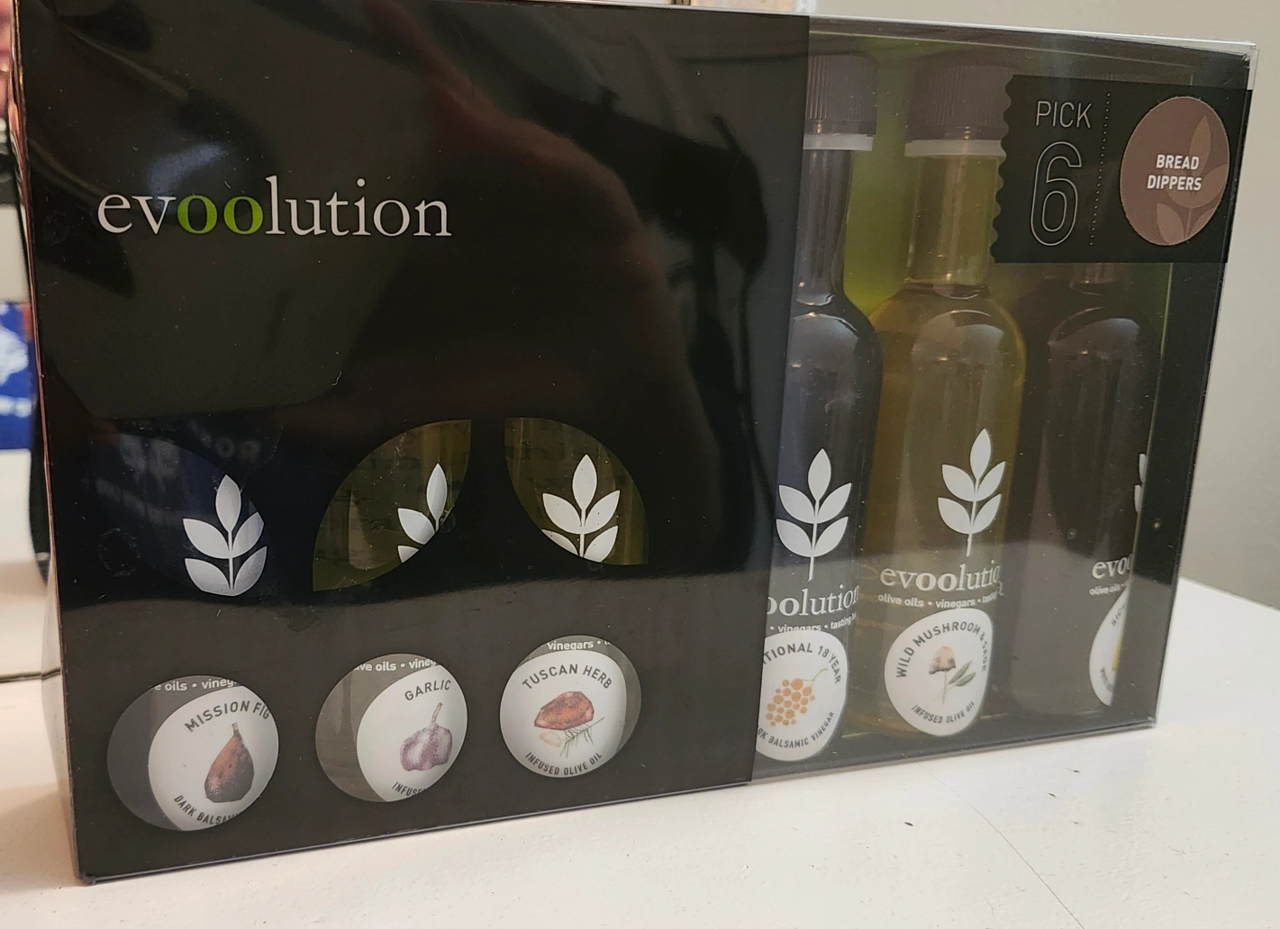 New Evoolution six-pack gift set. Includes various olive oils and vinegars. Perfect gift for foodies. I have 2 unopened packages of 6 oils. I've had these both for a over a year. there is no expiry date on them but they are apparently best up to 18 months. $5 each.