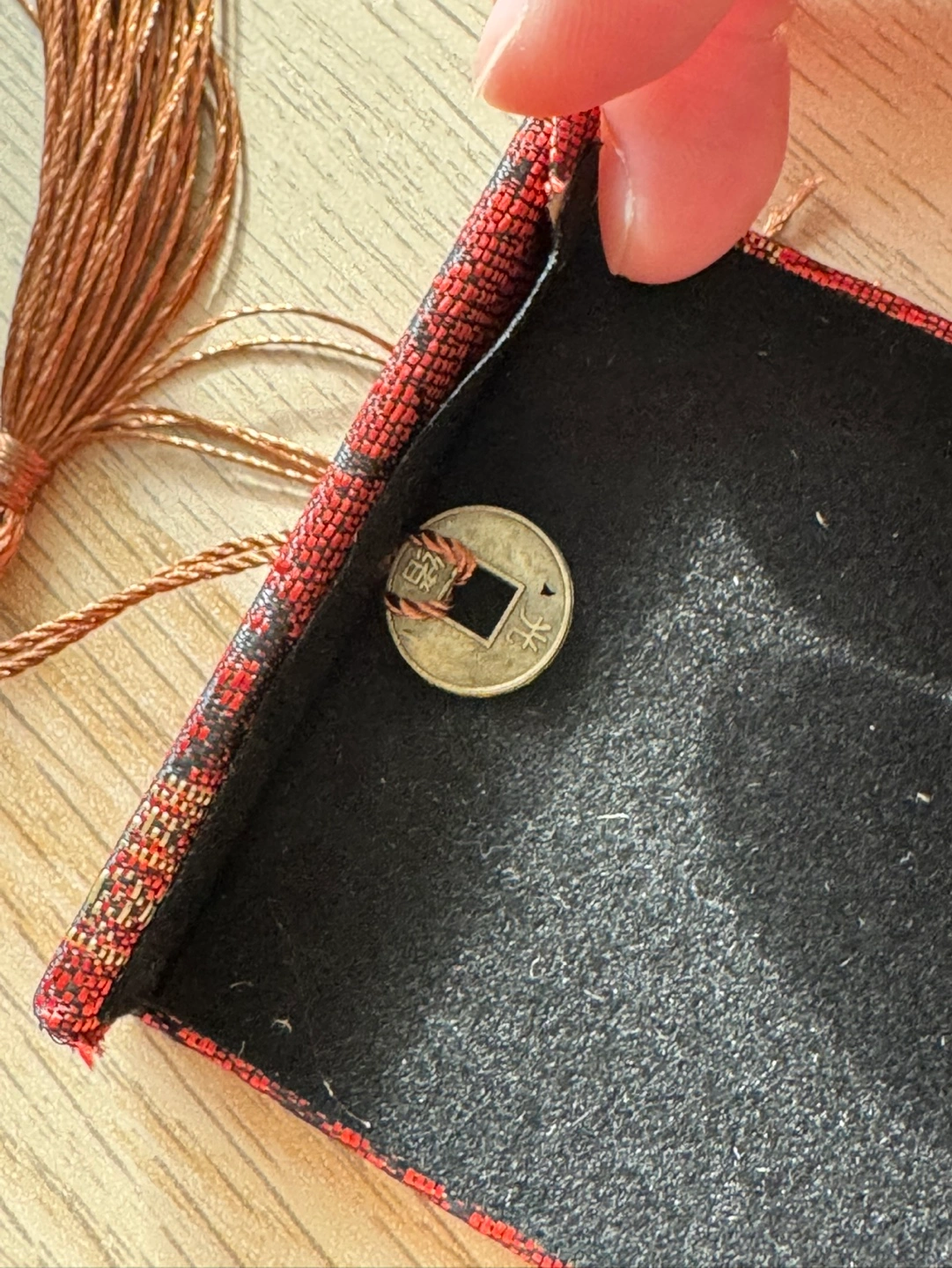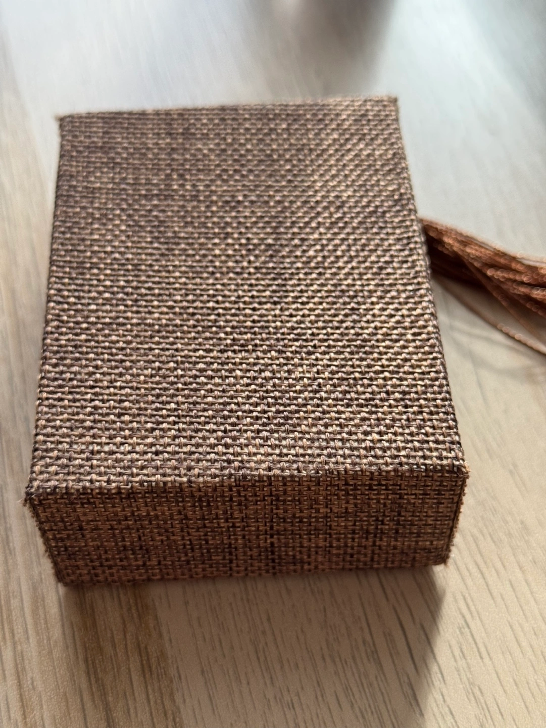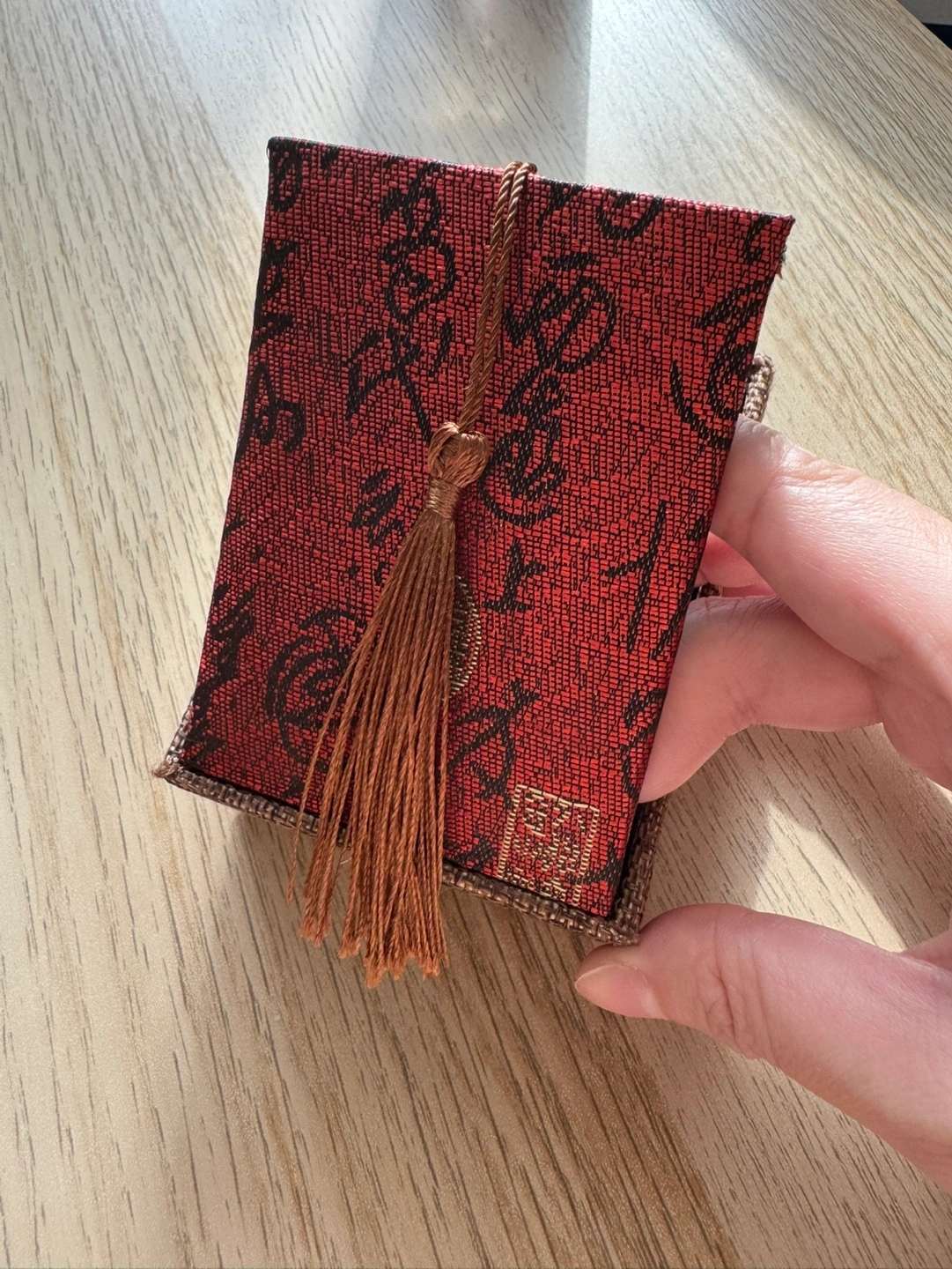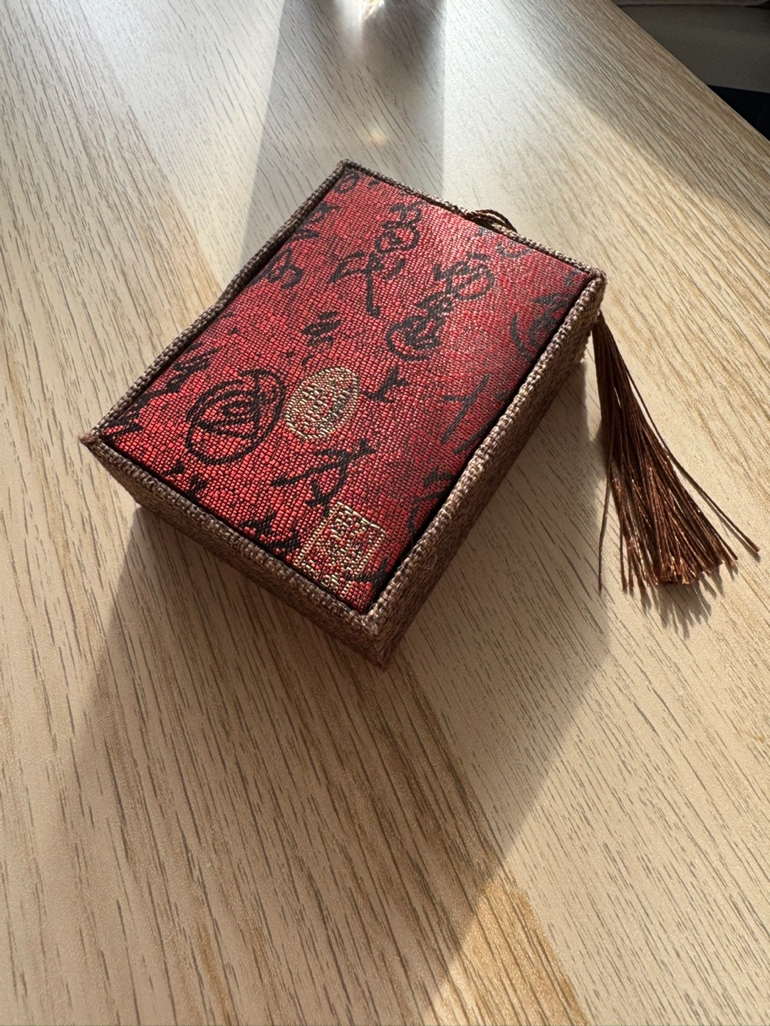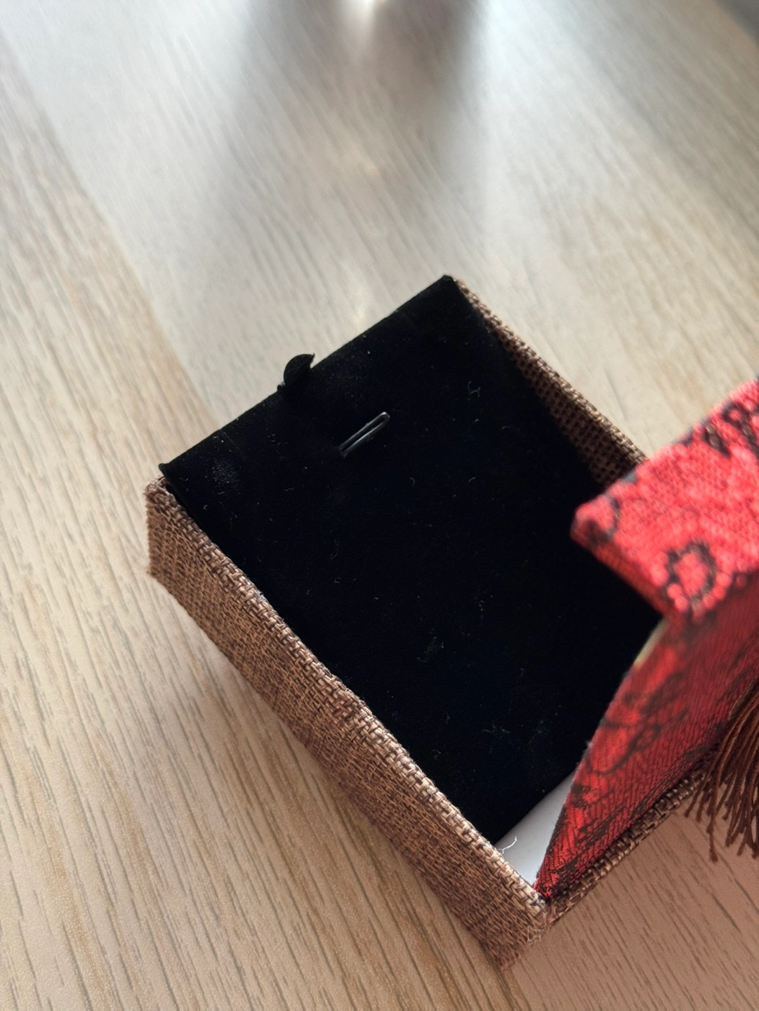 Small jewellery box. Red fabric exterior with brown trim. Brown fabric interior. Features a small tassel. Perfect for storing small jewellery items.