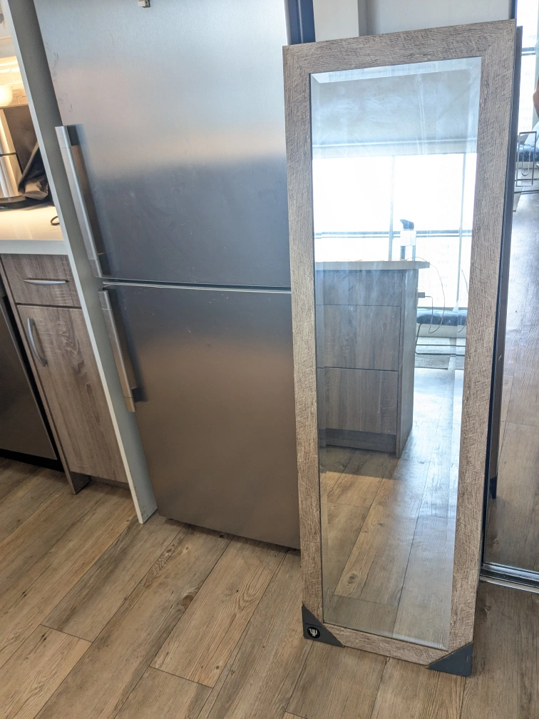 Floor-length mirror. Light brown wood frame. Modern style. Perfect for any room.
