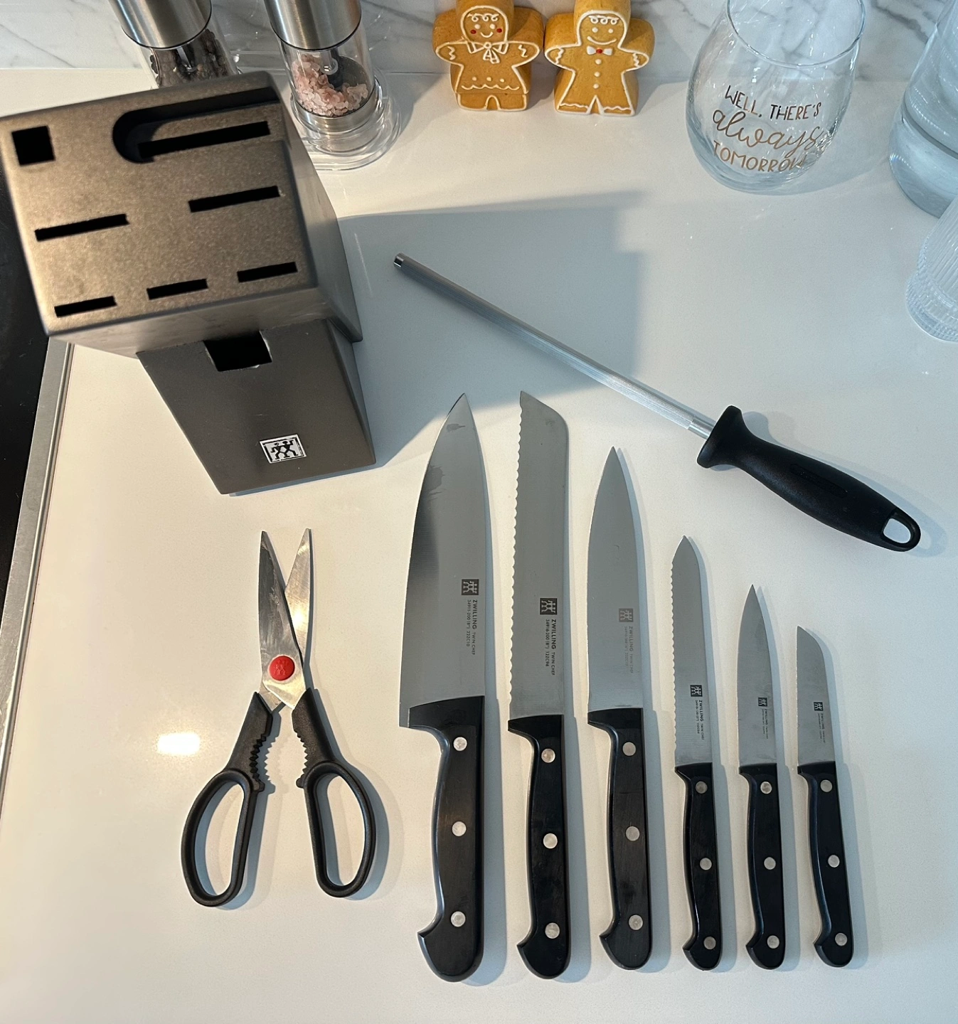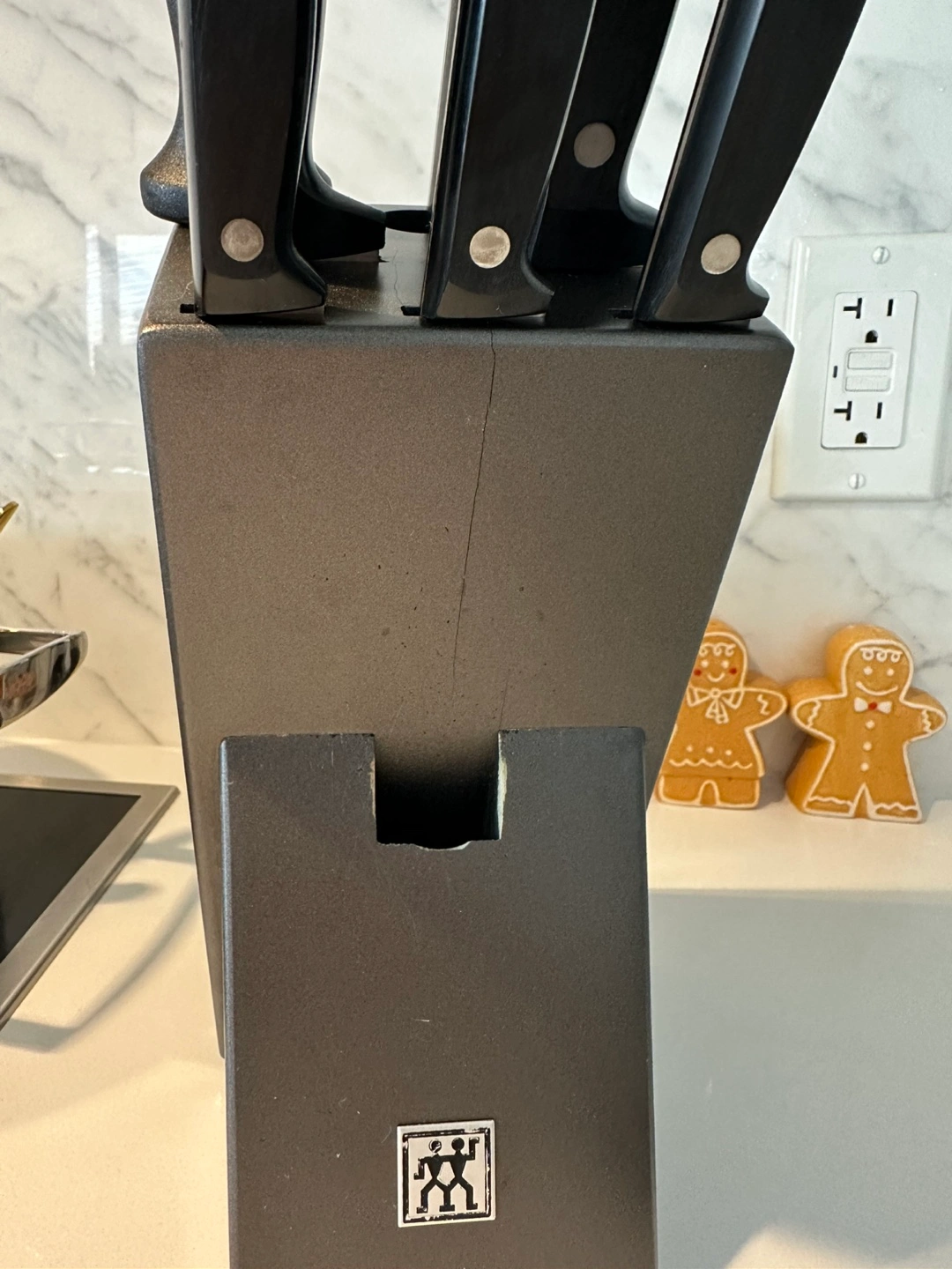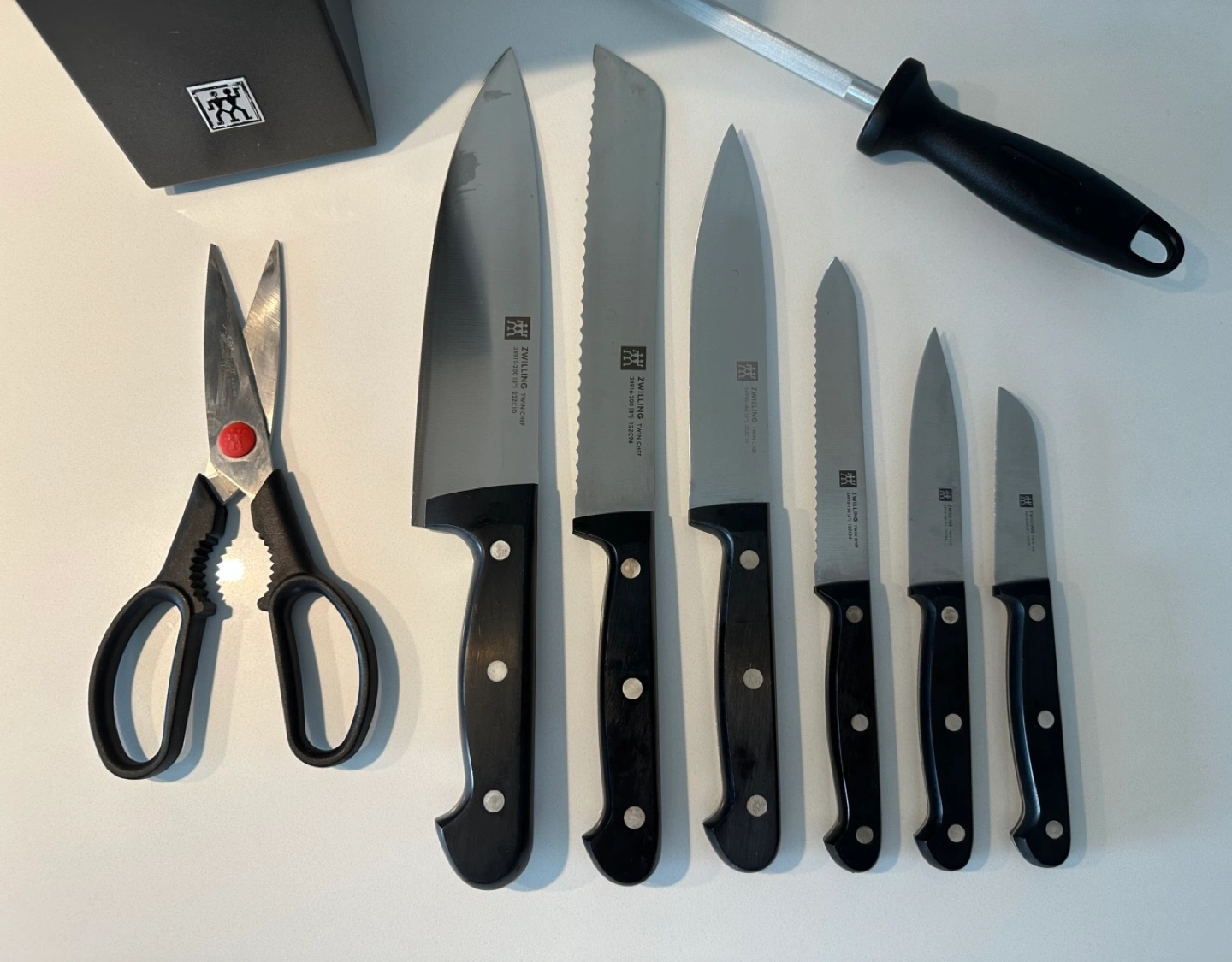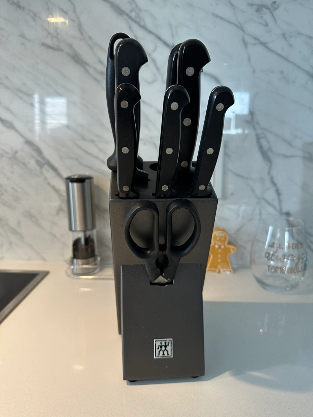 The 9-piece set from ZWILLING consists of a knife block, a vegetable knife, a paring knife, a utility knife, a slicing knife, a chef's knife, a bread knife, a sharpening steel and a multi-purpose scissors. ! Pls note there’s a crack on the knife block (as in the last picture). More details - https://www.zwilling.com/ca/zwilling-twin-chef-2-9-piece-knife-block-set-anthracite-34936-200/34936-200-0.html Current Retail Price - $249.99 (Pre-Tax) Open to offers! Only available for pickup at Downtown Toronto (Harbourfront)