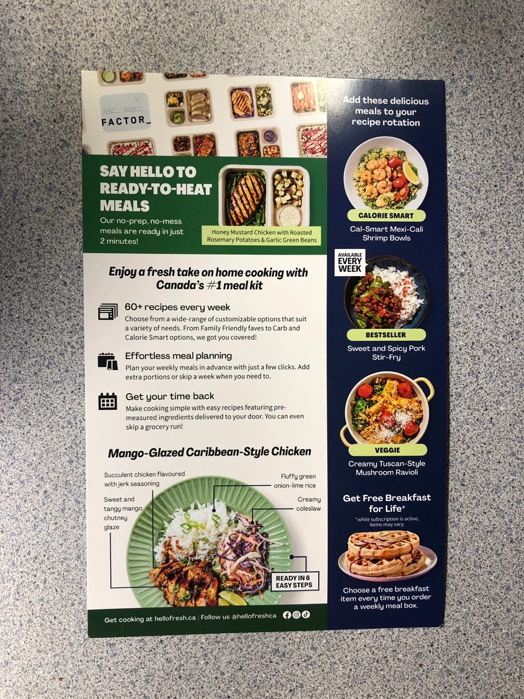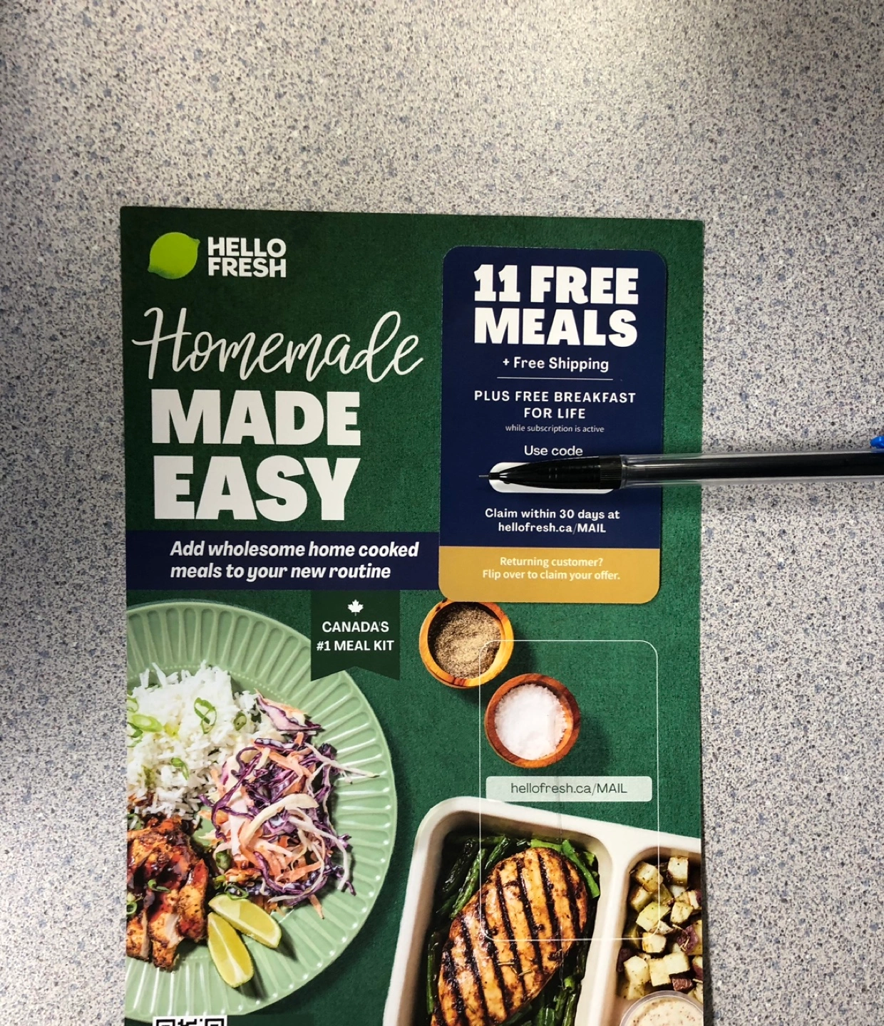 1000+HelloFresh promotional brochure. Features offer for 11 free meals plus free shipping. Includes details on meal options and recipe ideas. Canada's #1 meal kit. Pickup from Christie station after 4:30pm during the week days