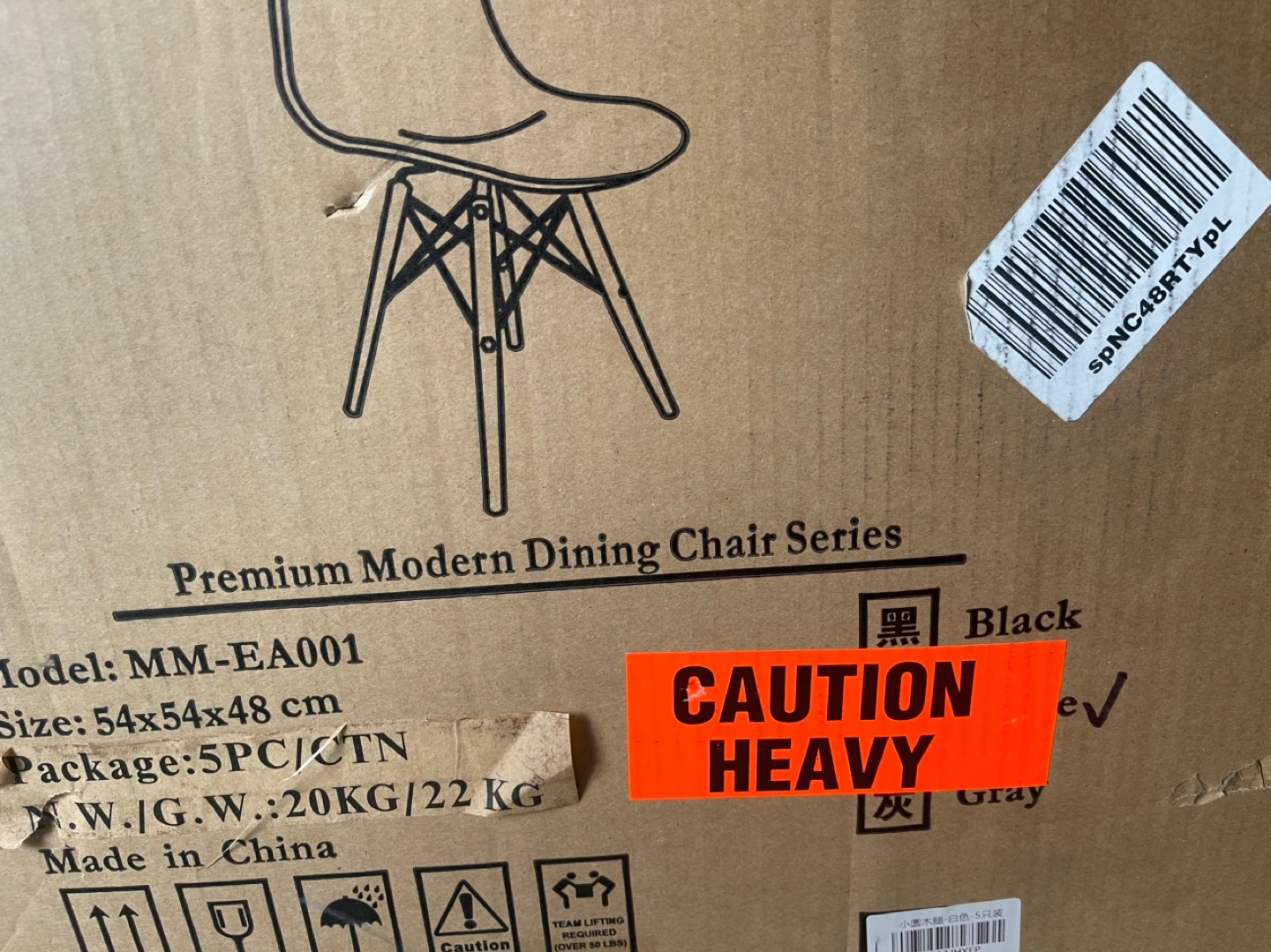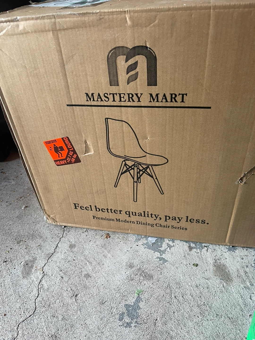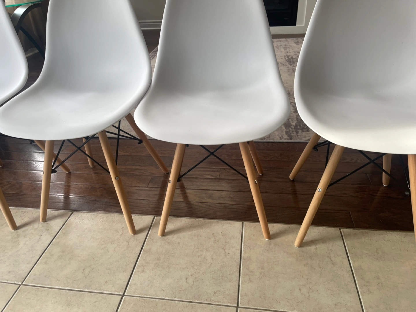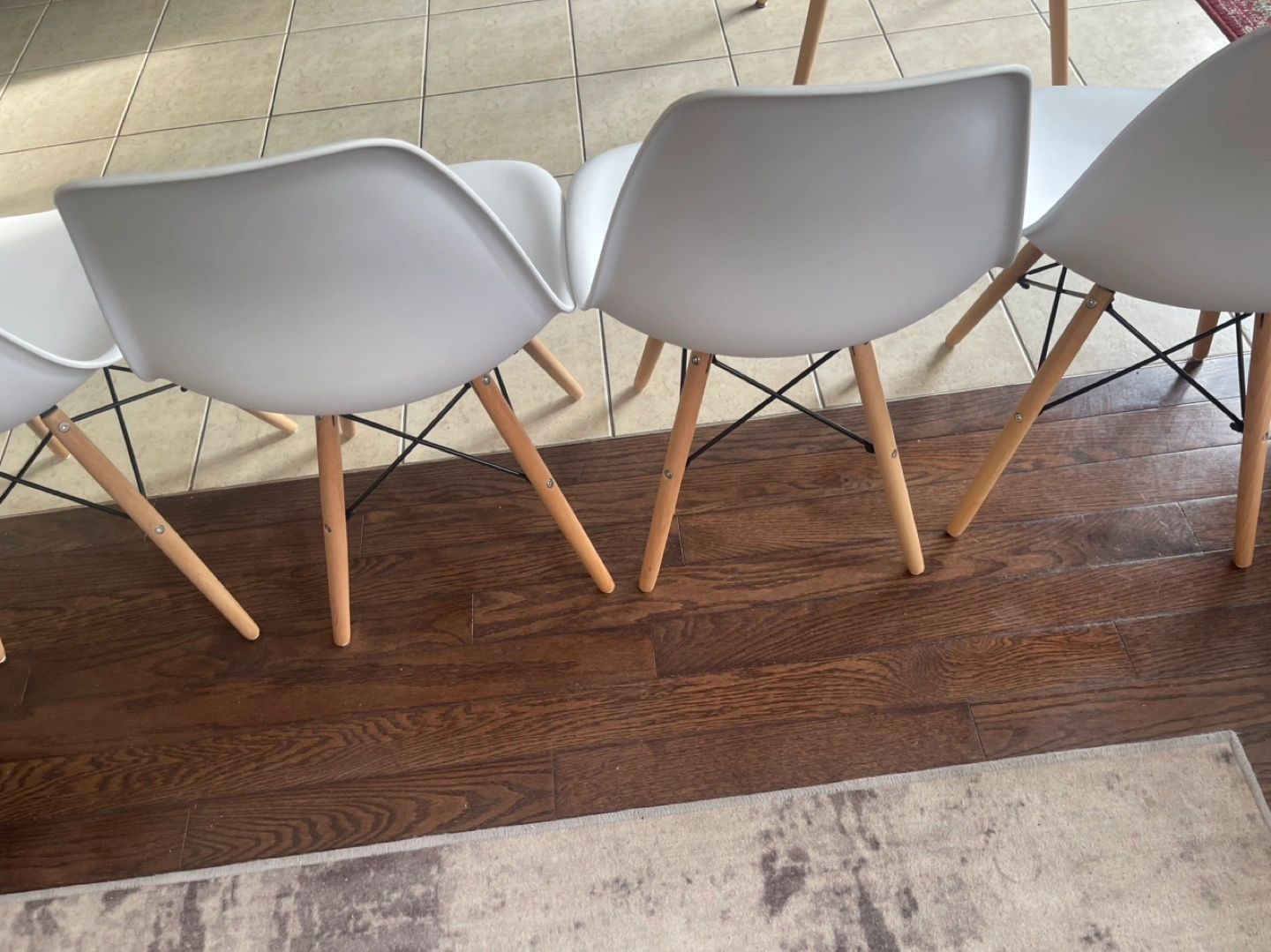 18Five white plastic chairs with light wood legs. Modern design. Excellent condition. Purchased from Mastery Mart.