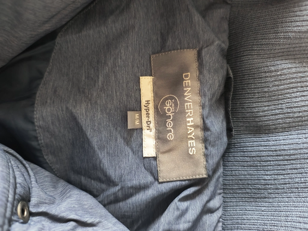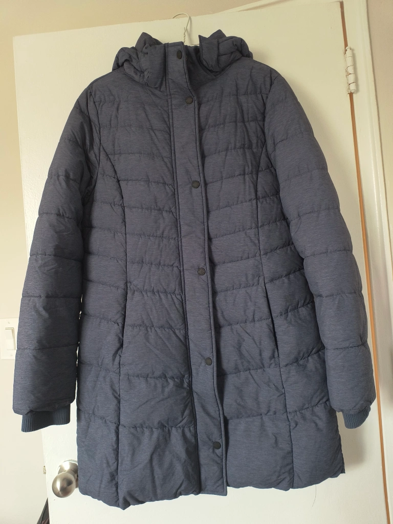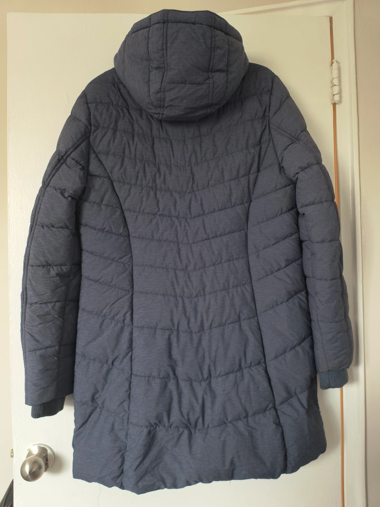 Women's puffer jacket for winter. Size medium. Features a hood and ribbed cuffs. Dark grey colour. Hyper-Dri technology.