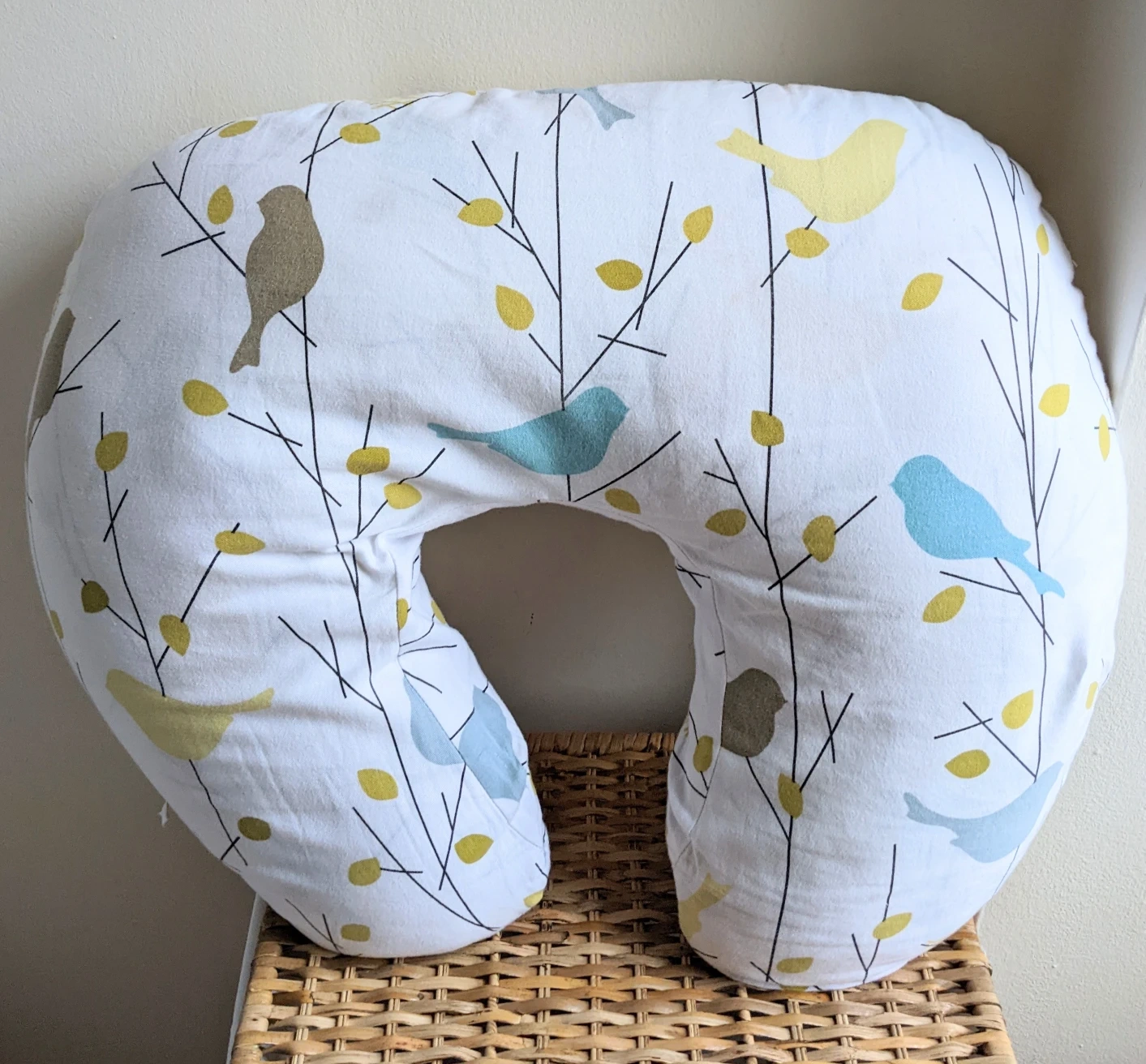 Gently used breastfeeding pillow, includes a cover matching the pillow pattern. The cover is a great for maintaining the pillow clean!