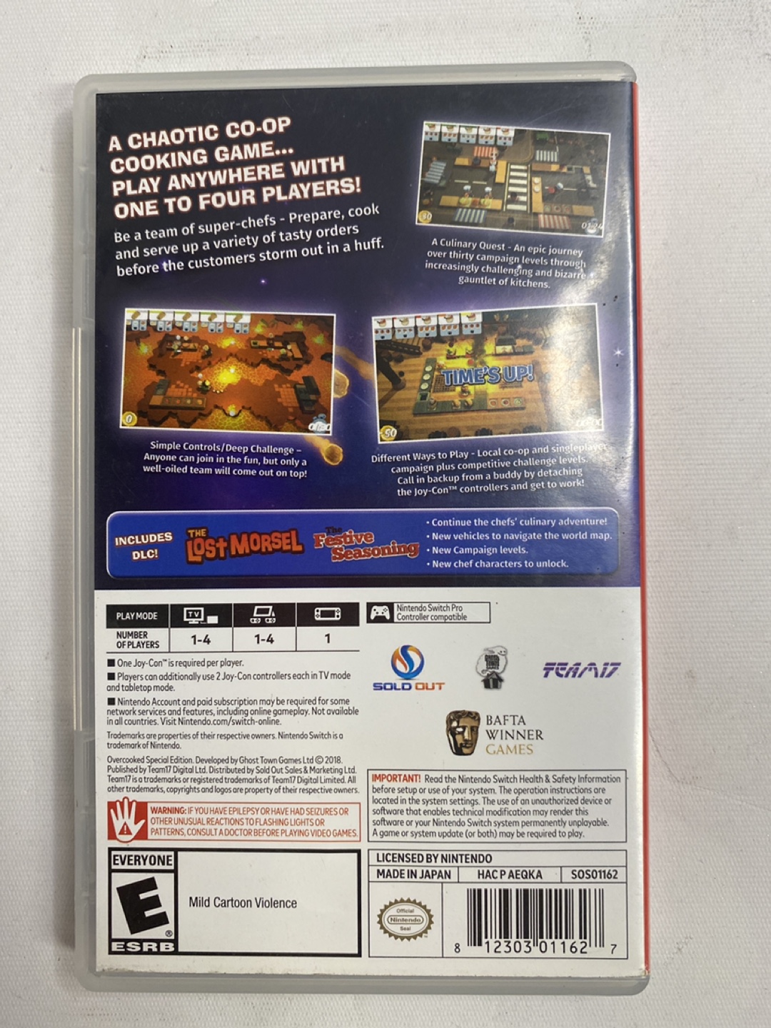 Chaotic co-op cooking game. Play anywhere with up to four players. A team of superb chefs. Prepare, cook and serve various dishes before customers storm out in a huff. Includes DLC: The Lost Morsel and Festive Seasoning. Rated E for Everyone.