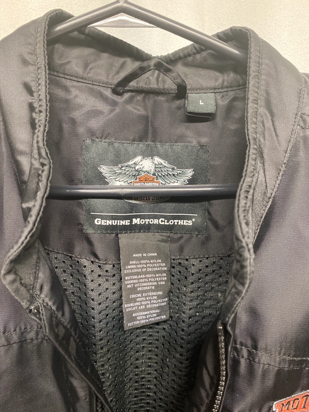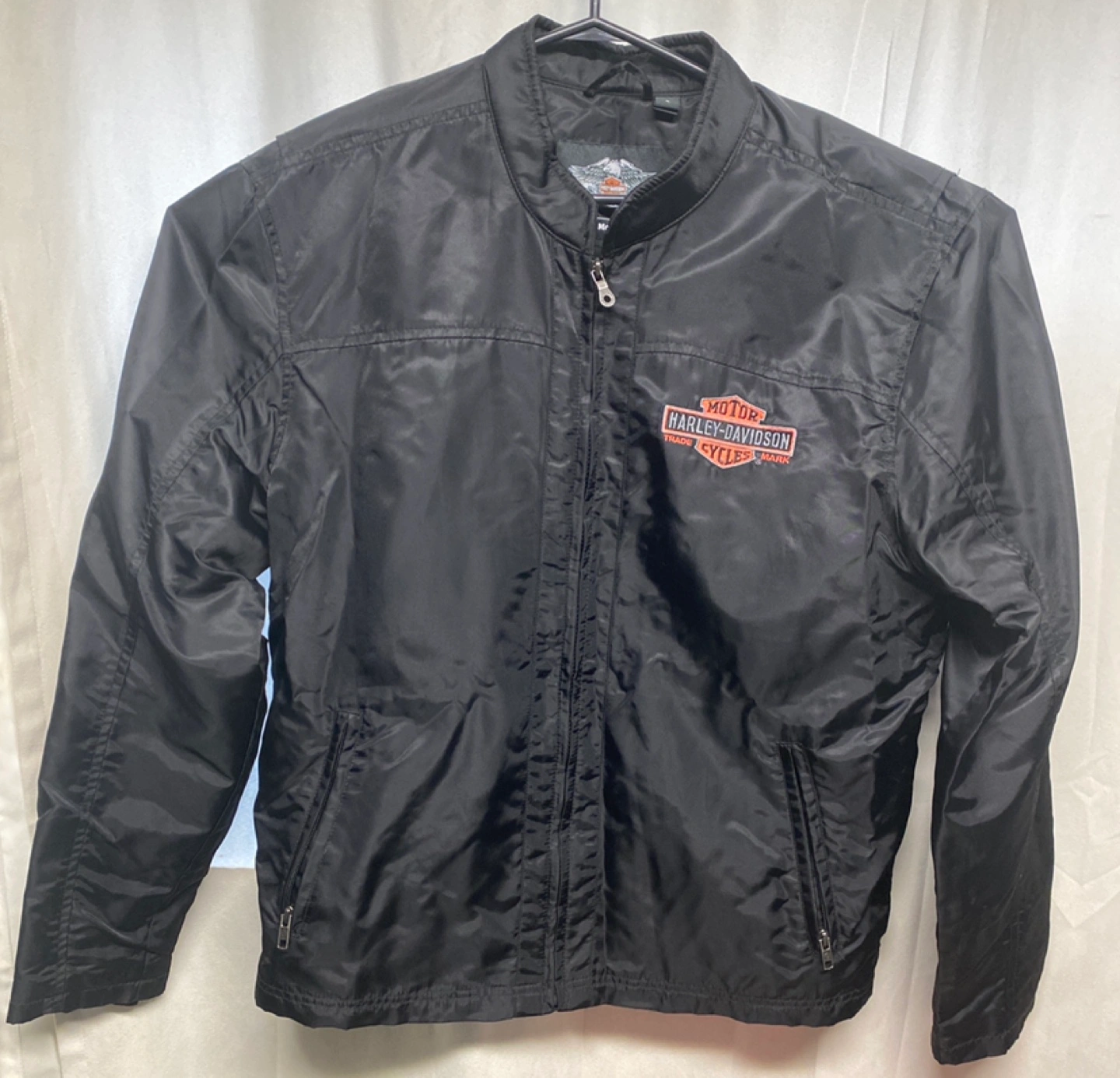 Men's size large black Harley-Davidson Genuine MotorClothes jacket. Full zip closure. Multiple pockets. Embroidered Harley-Davidson logo on back and front. Lightweight nylon material. Great for layering. Chest 21 in length 28 in