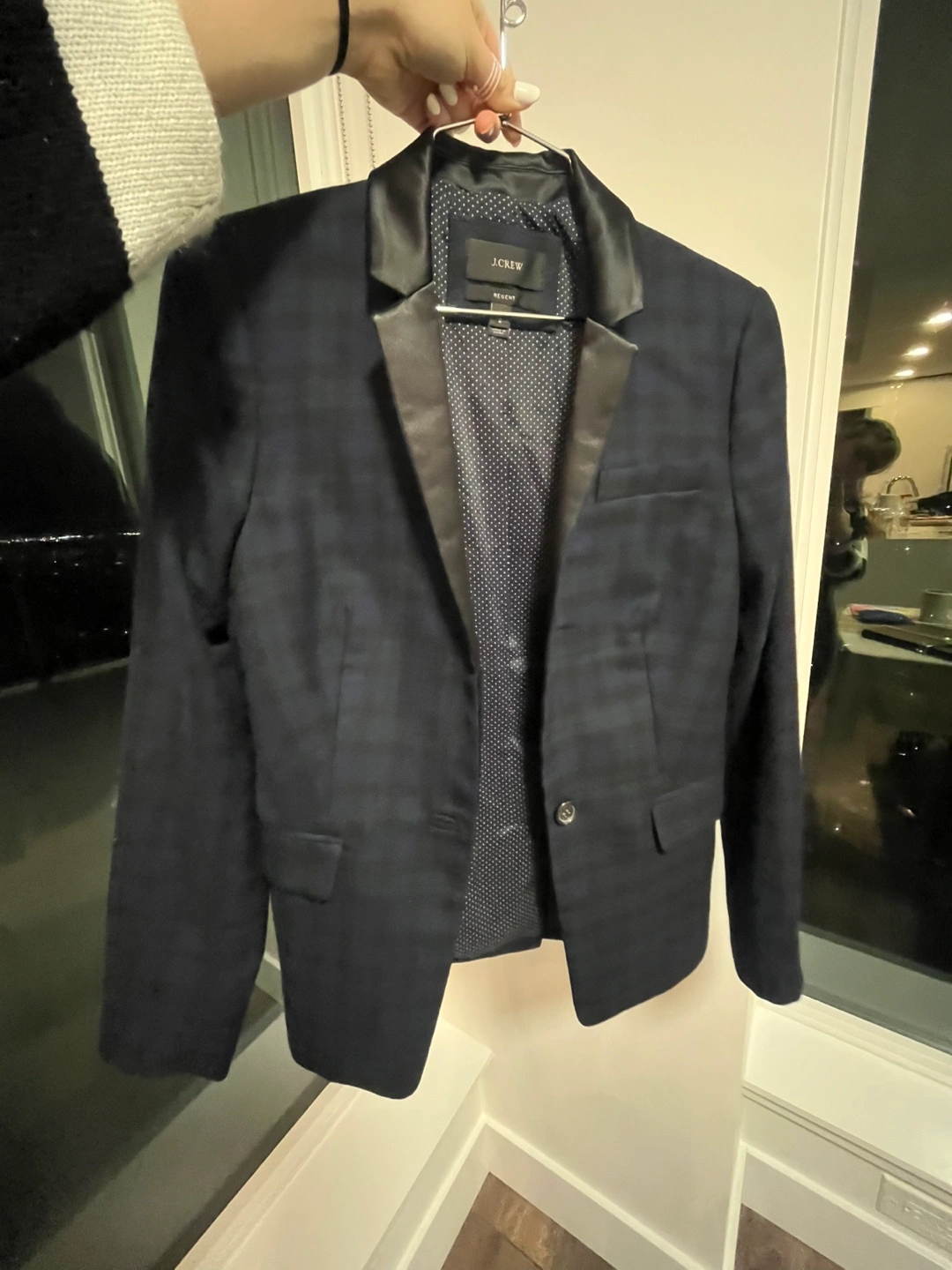 161Women's navy blue blazer. Check pattern. Leather collar. Size 0.