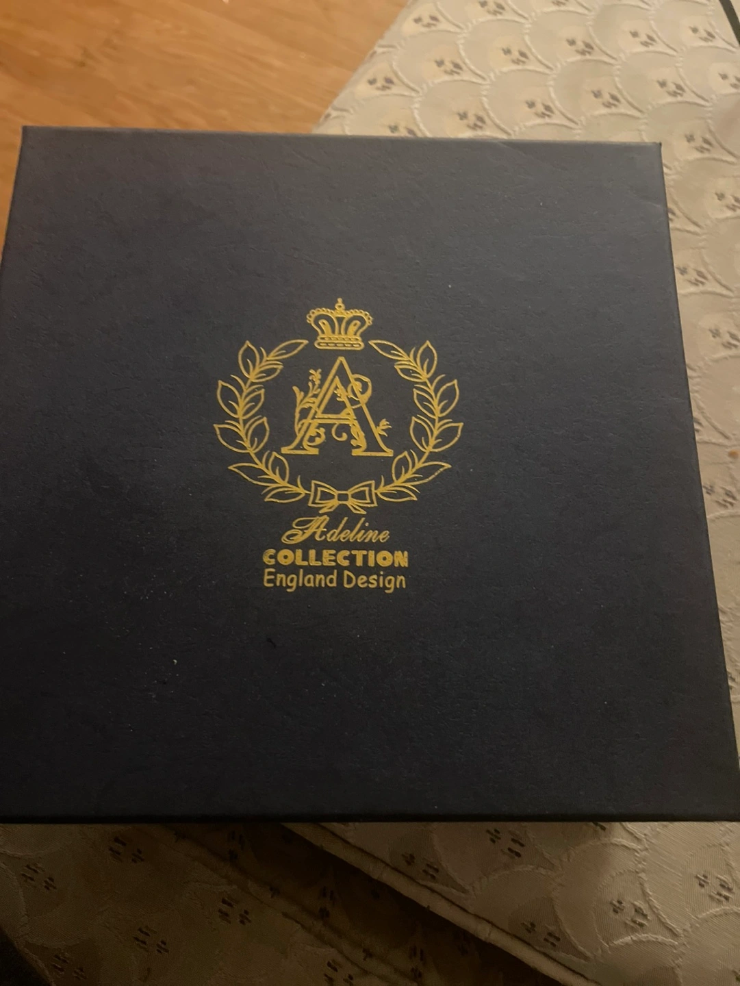 Elegant teacup and saucer set. Two teacups and saucers included. Gold accents. Presented in a navy blue gift box. Fine porcelain. Perfect gift.