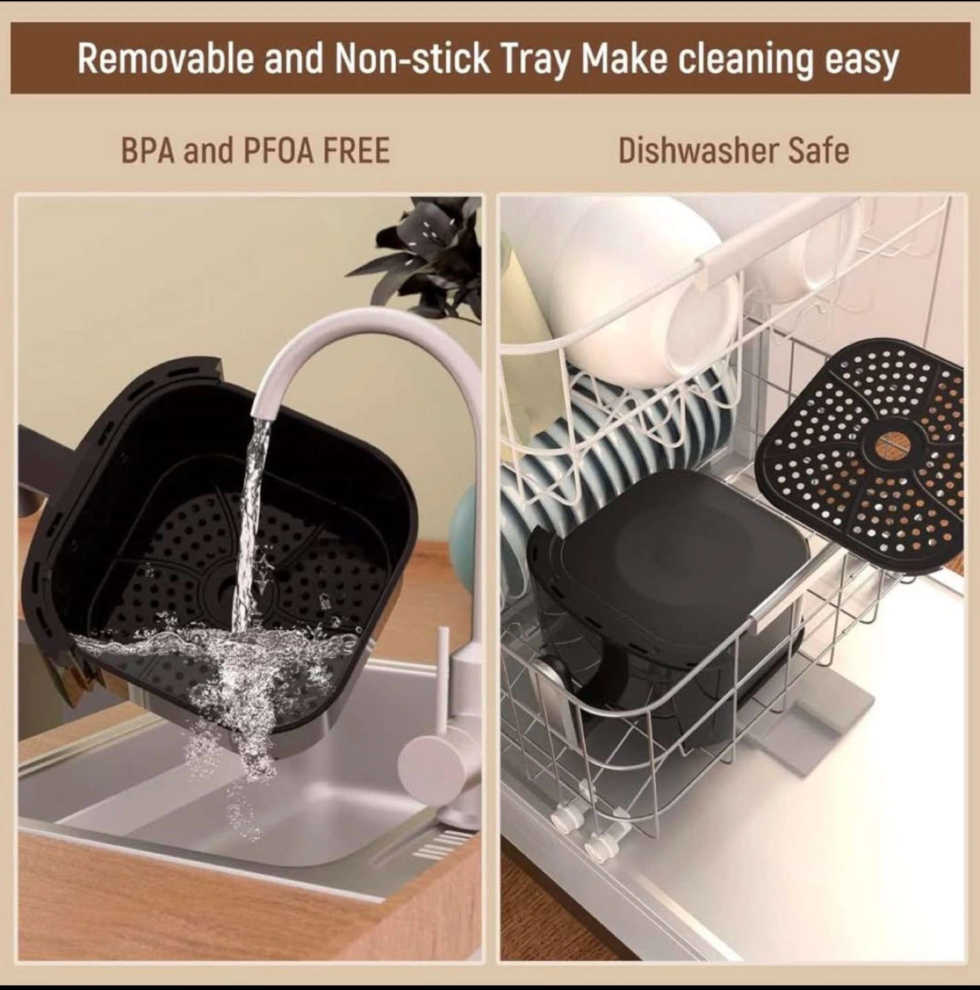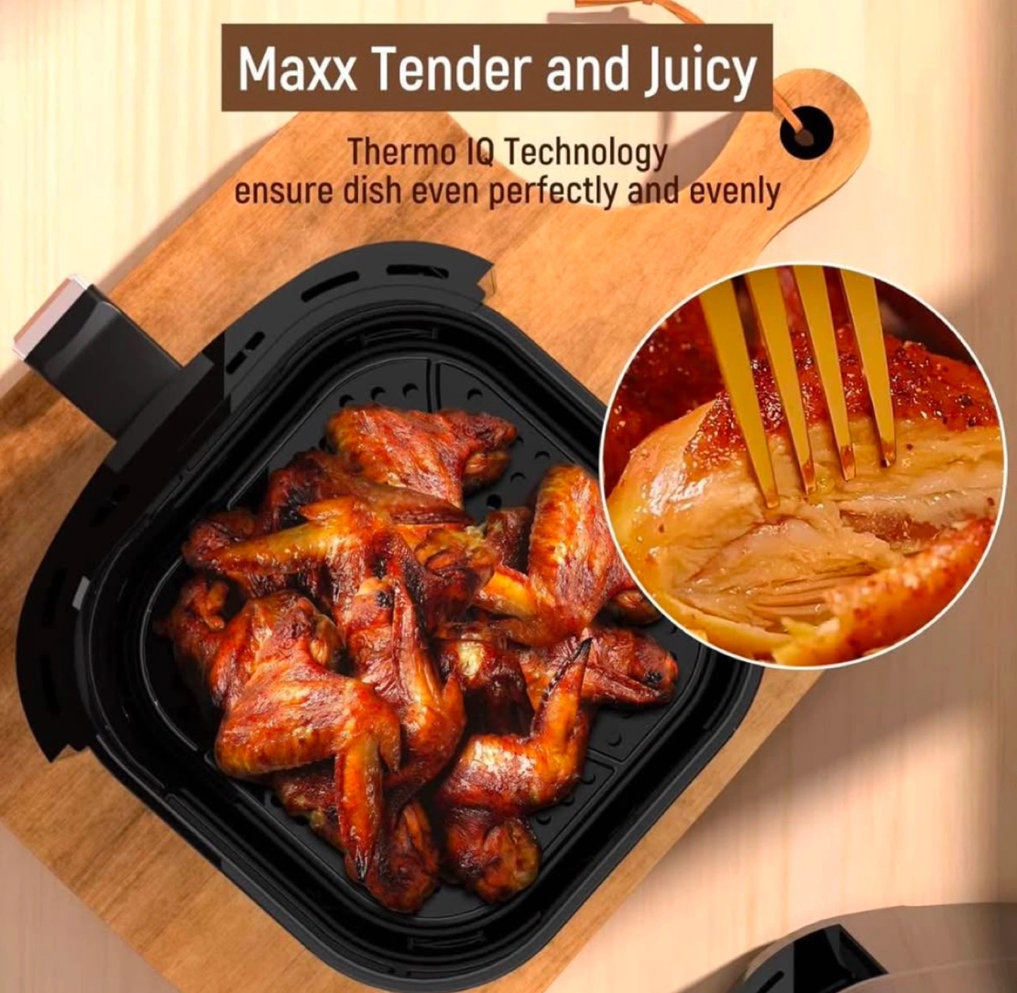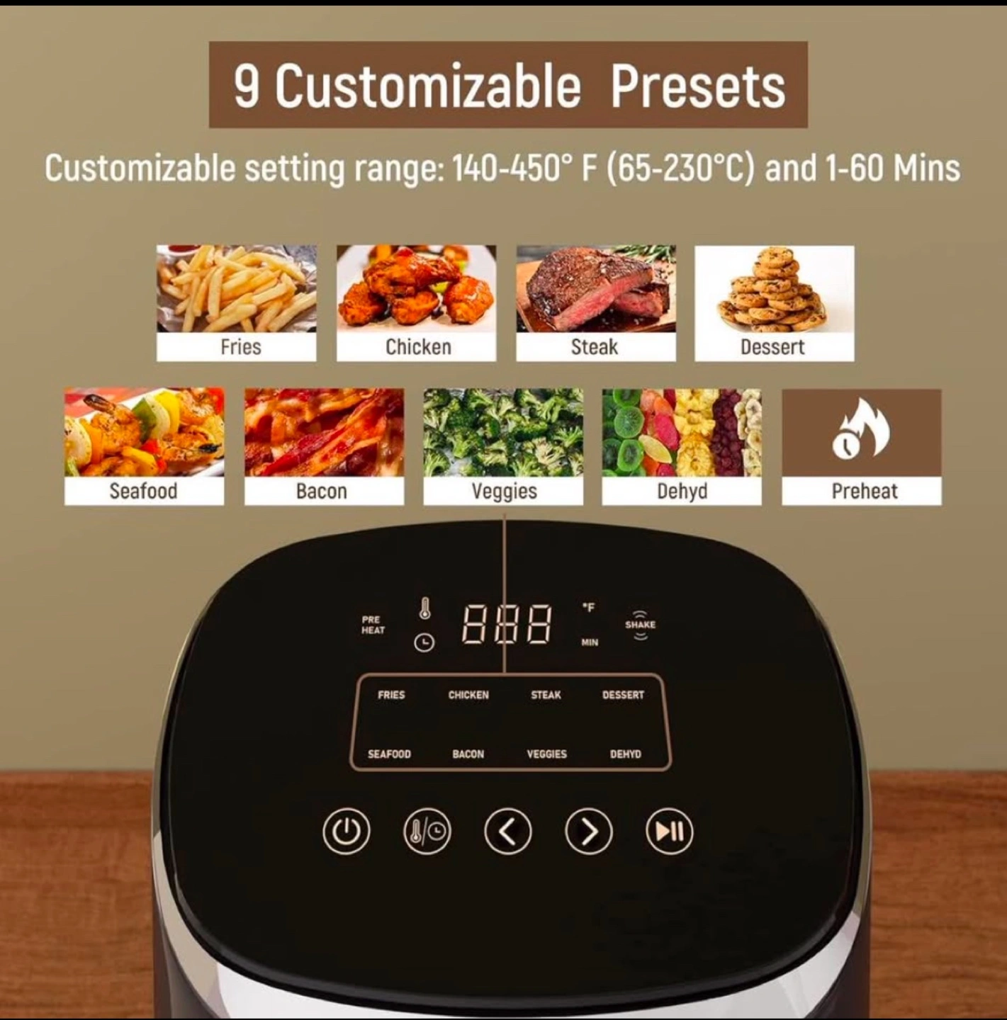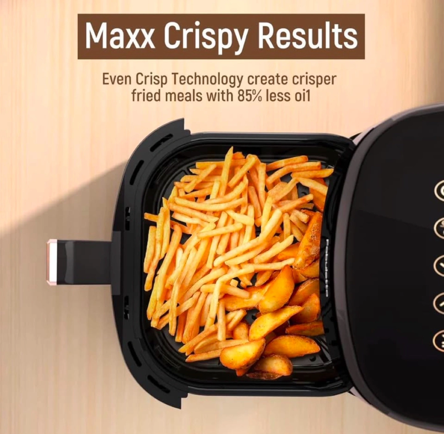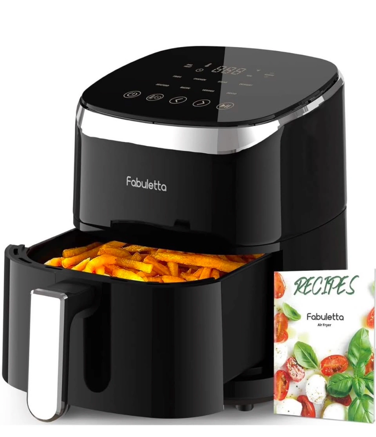 4-quart air fryer. Digital touchscreen controls. Cooks food quickly and evenly. Uses 85% less oil. Compact and sleek design. Includes recipe book.