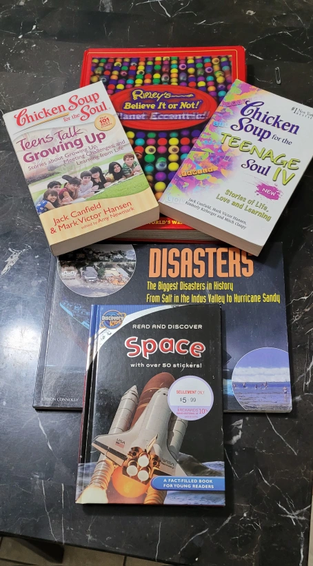 Collection of fivebooks. Includes two Chicken Soup for the Teenage Soul books, Ripley's Believe It or Not! Planet Eccentric game book, Teens Talk Growing Up, Disasters, and Space. Various authors and publishers. $2 each.