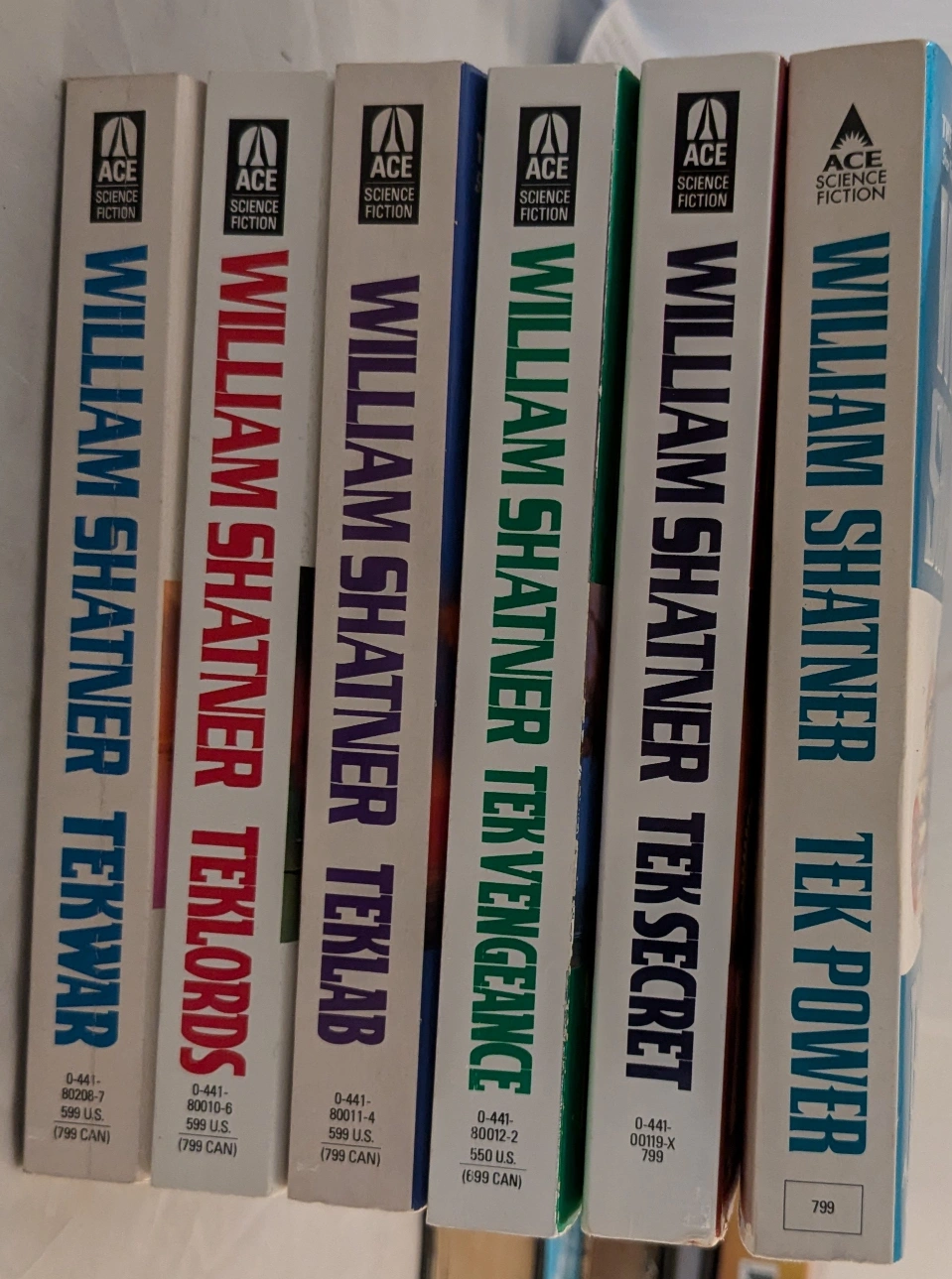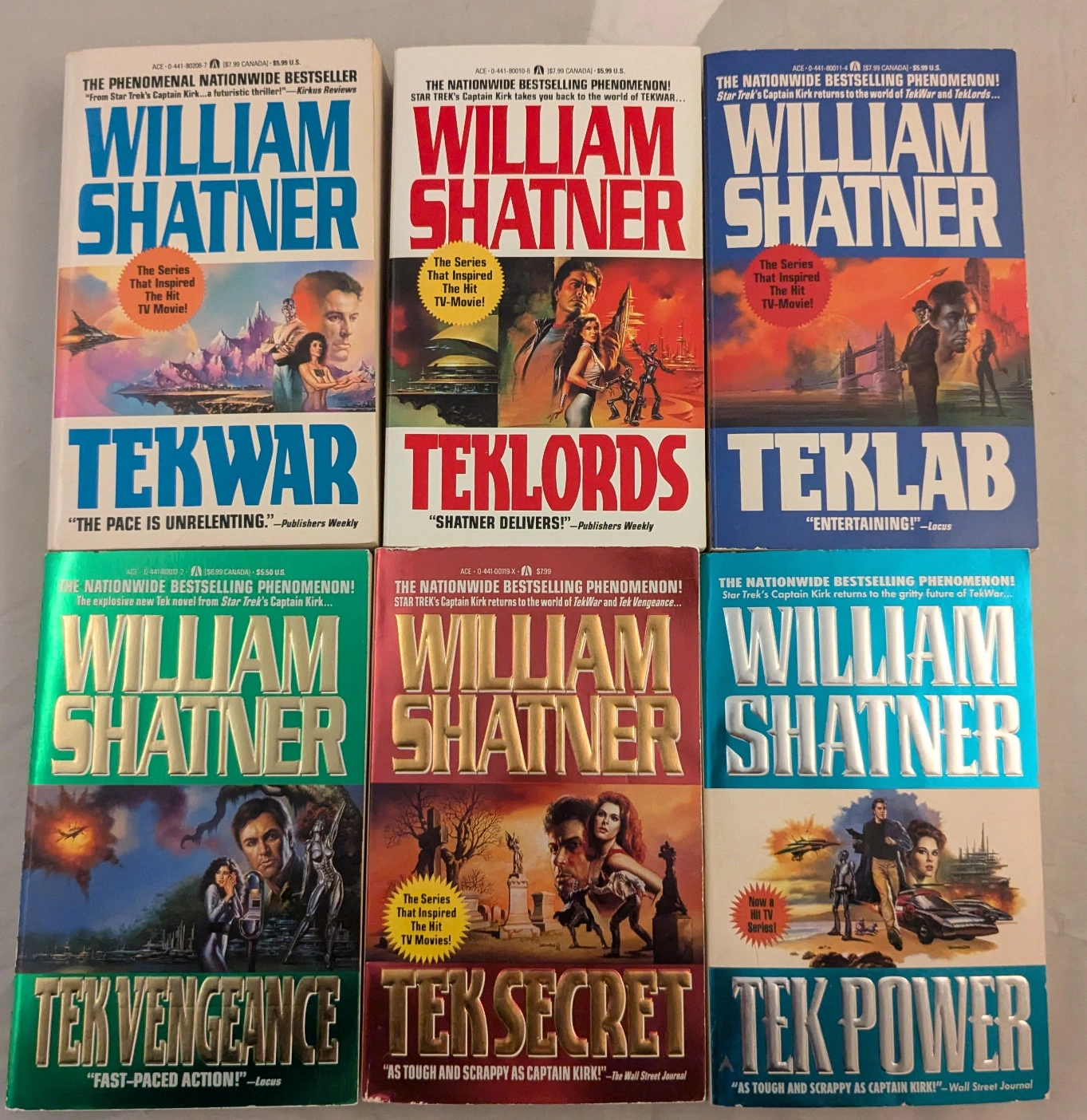 Collection of six William Shatner Tek novels. Ace Science Fiction paperback books. Includes TekWar, Teklords, TekLab, Tek Vengeance, Tek Secret, and Tek Power.