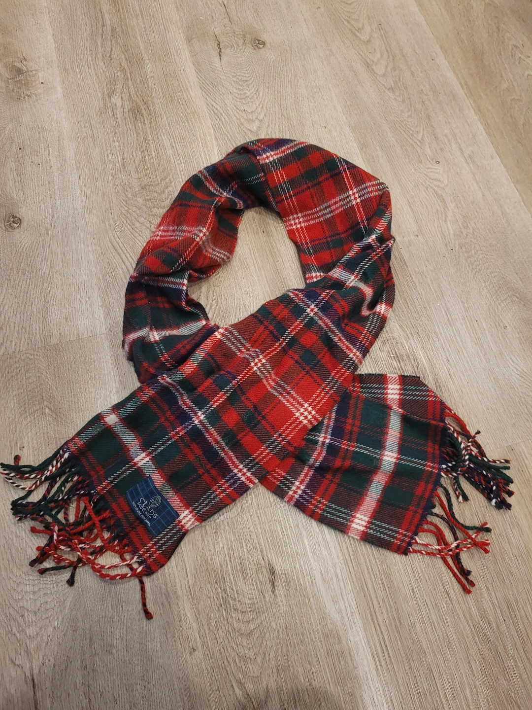 Red, green, white, and navy plaid scarf. Fringed edges. 100% pure new wool. Never worn, but it's gotten a little dusty in the closet