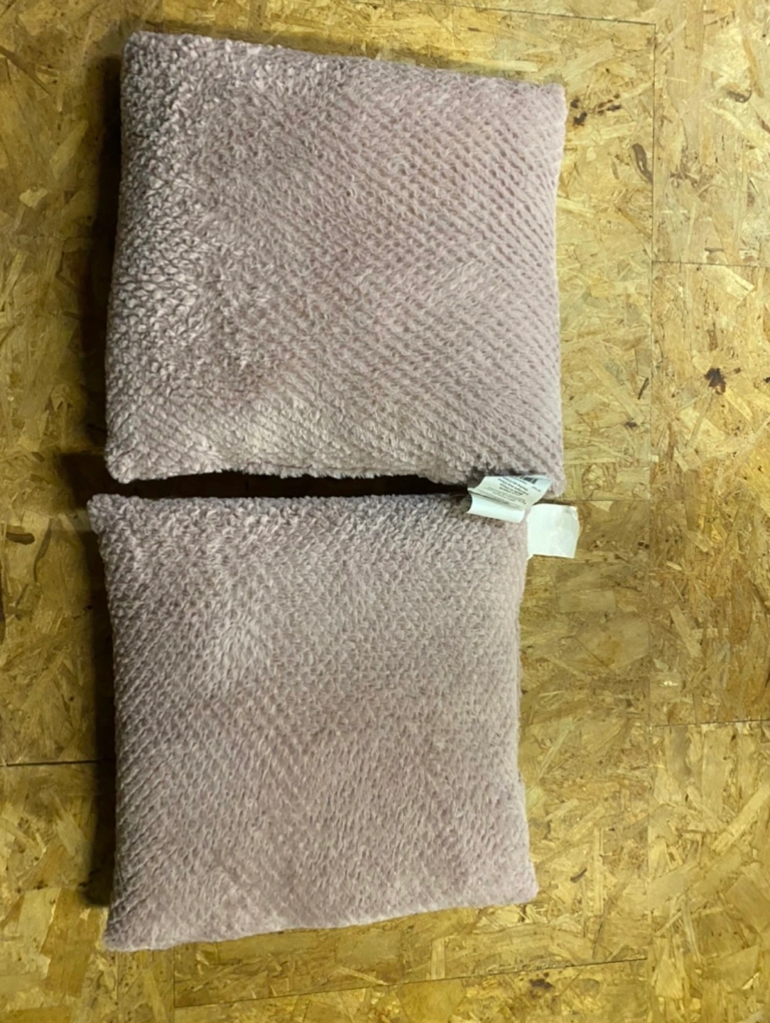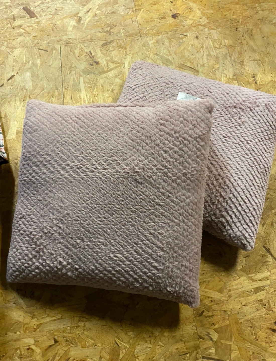 Two mauve-toned plush pillows. Soft, textured fabric. Measures 20x20 inches. 100% polyester fiber. Made in China.