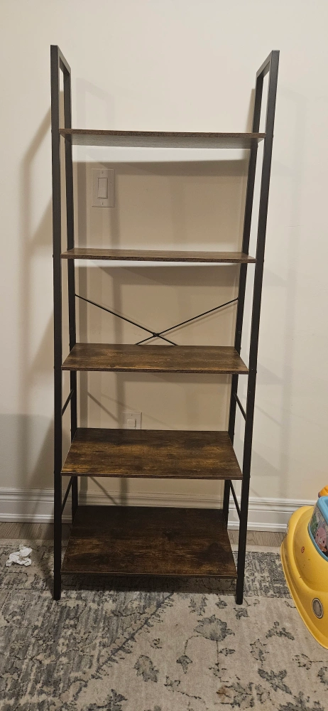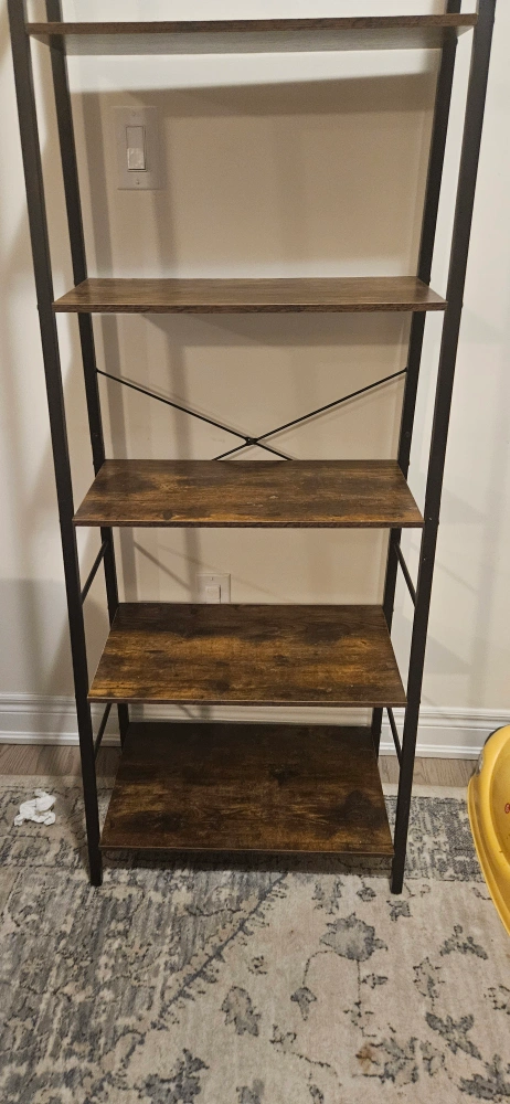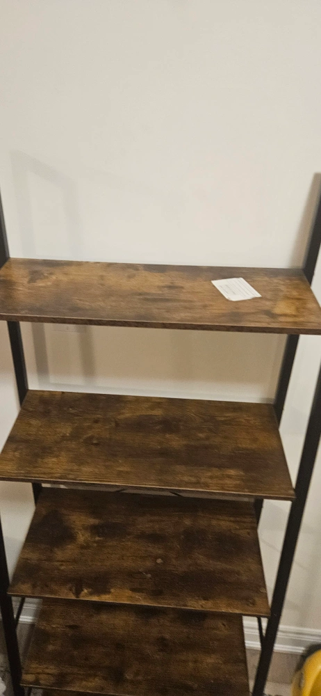26Tall five-shelf bookcase. Dark brown wood shelves and black metal frame, barely used. Pet free and smoke-free house.