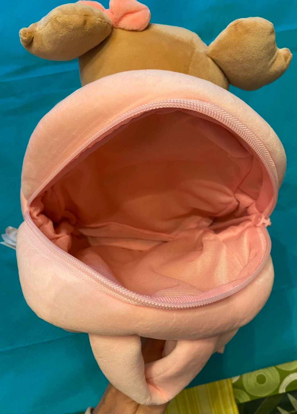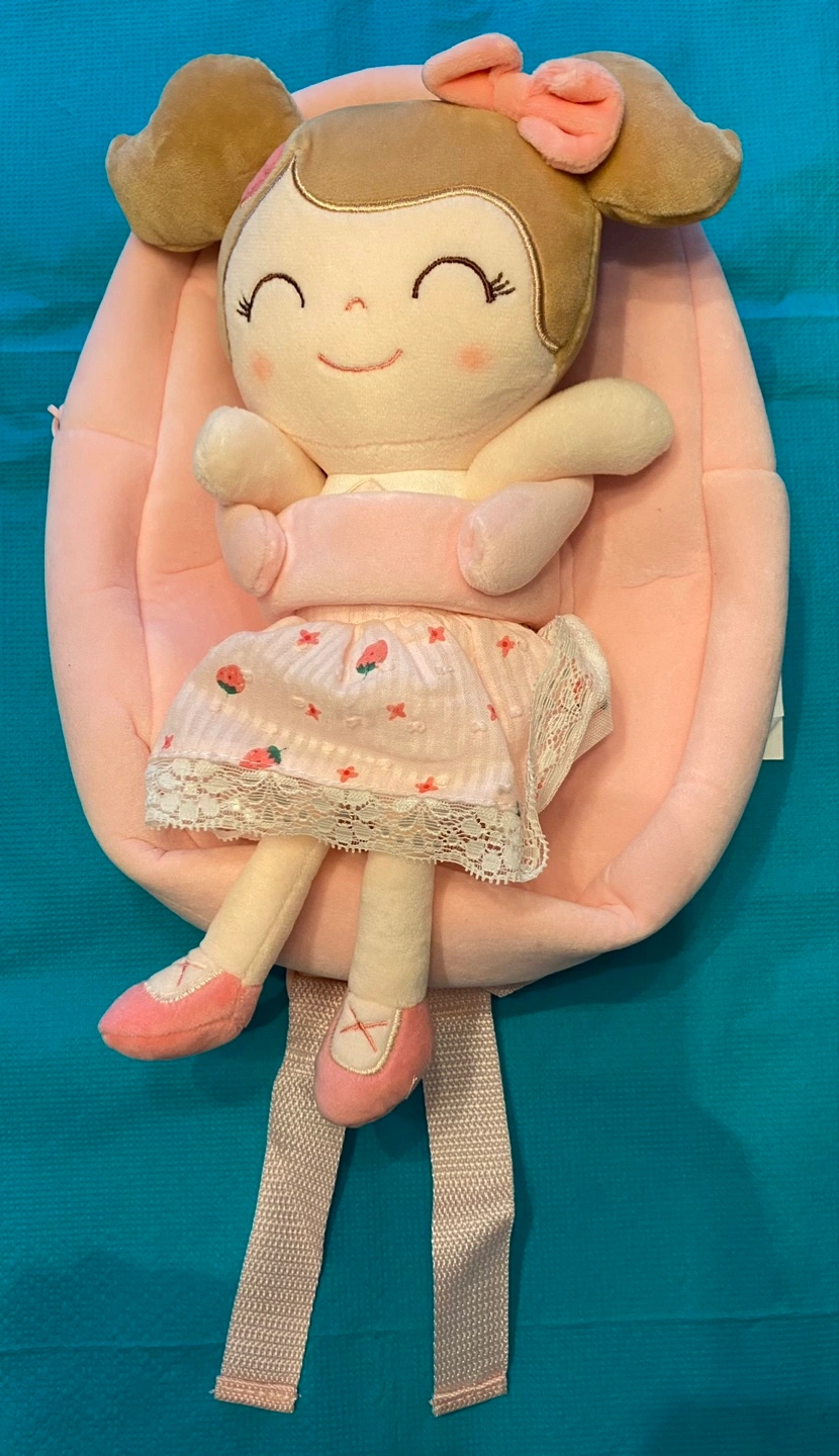 Pink plush backpack featuring a cute girl doll. Perfect for preschool or daycare. Zipper closure. Adjustable straps. Small size.