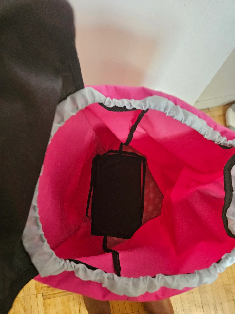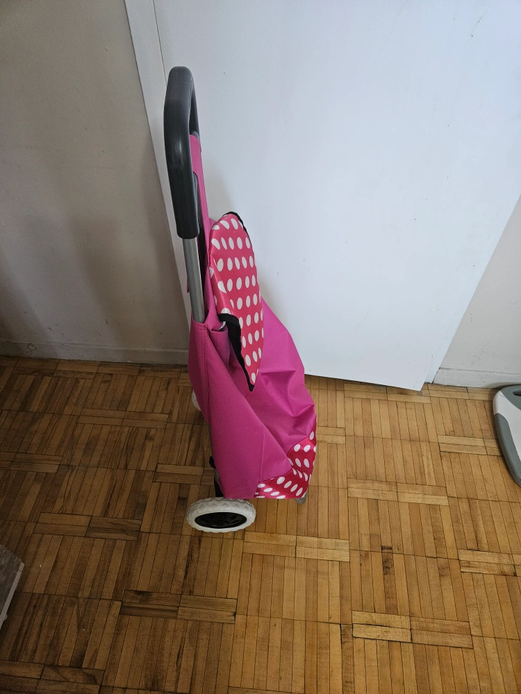 Portable shopping cart. Pink fabric with white polka dots. Collapsible design. Features a convenient carrying handle and wheels for easy transport. Ideal for groceries or other items.