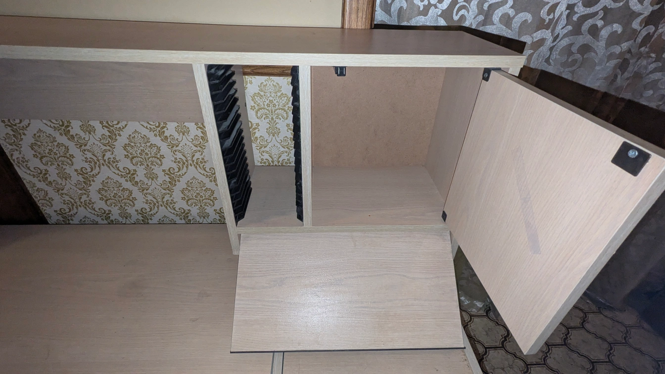 - small cabinet door on the hutch is opened and closed using pressure