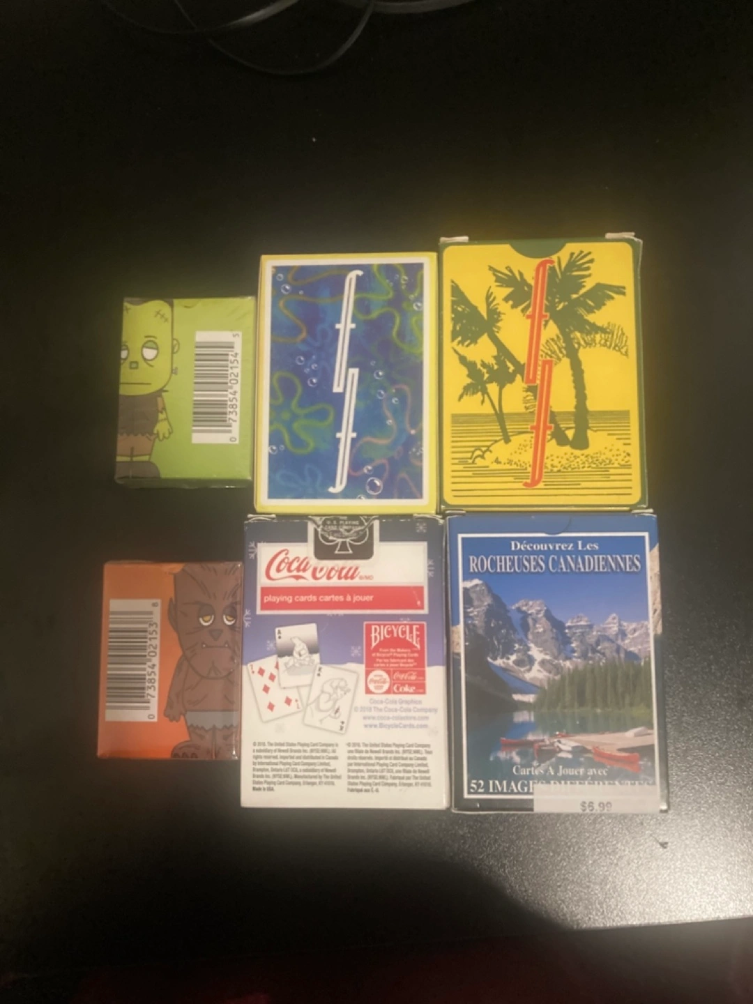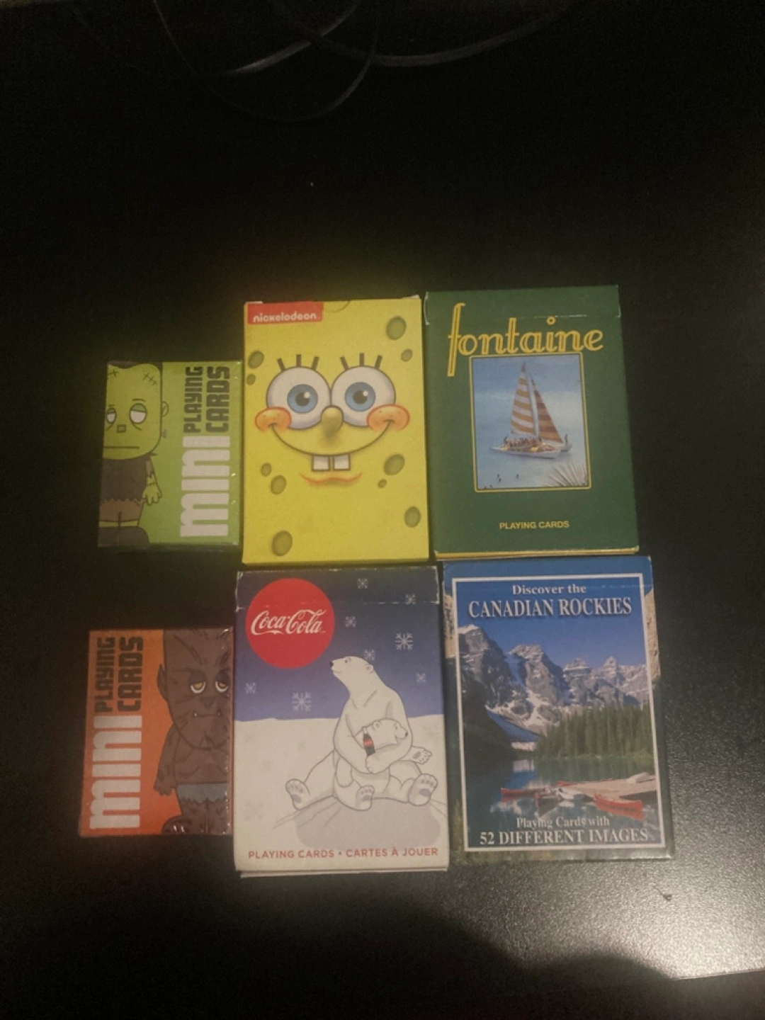 388Six deck bundle SpongeBob- $2 Fontaine SPF - $5 Bicycle Cola - $5 Unopened bicycle mini decks - $1 Canadian rockies - $4 Meet up at dufferin mall or closes station to you.