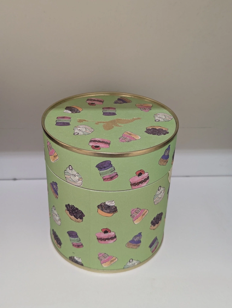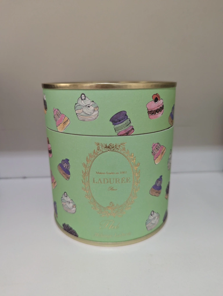 Empty Laduree cylindrical tea tin. Pastel green with gold accents. Features a pattern of pastries. Perfect for storage or organization. Selling most of my stuff to declutter. Pick up only. Cash only. Reasonable offers welcome, especially if you're getting multiple items.