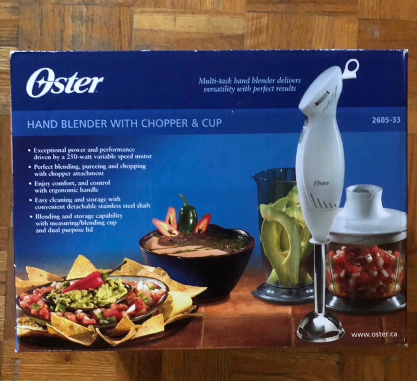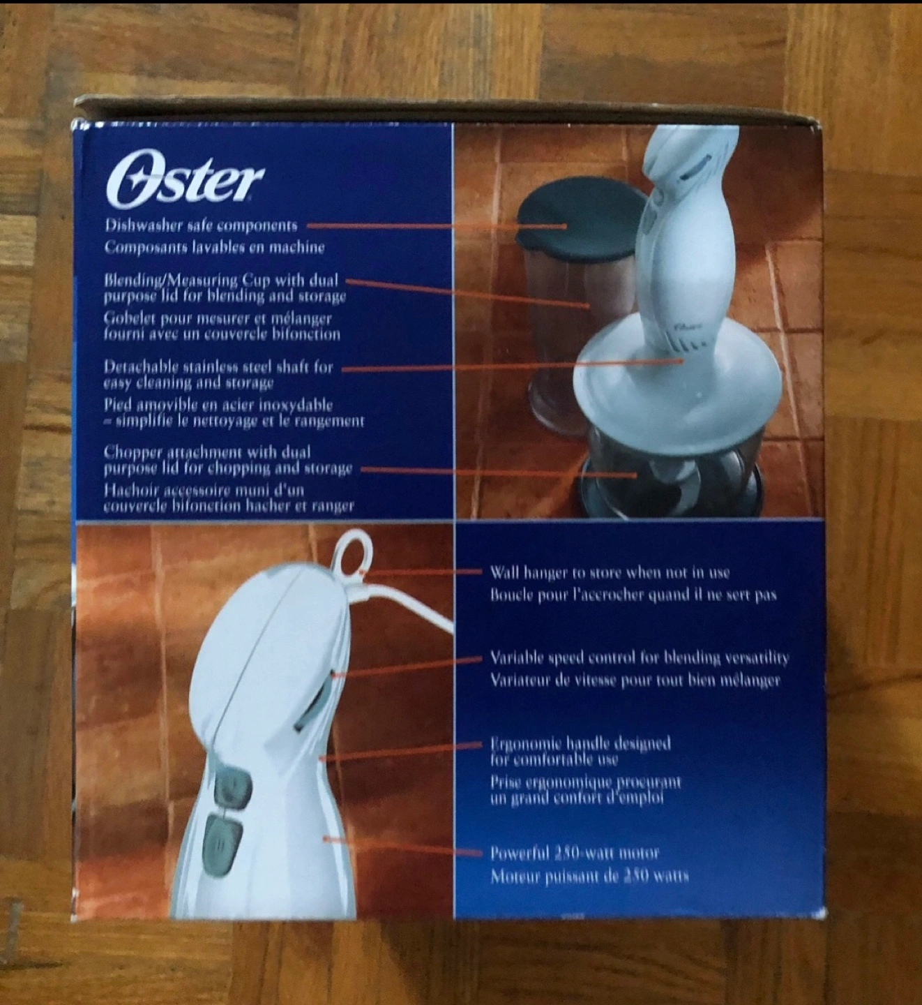 Powerful 250-watt motor. Variable speed control for blending versatility. Ergonomic handle. Easy cleaning and storage. Dishwasher safe components. Includes blending/measuring cup and dual-purpose lid. Chopper attachment with dual-purpose lid.
