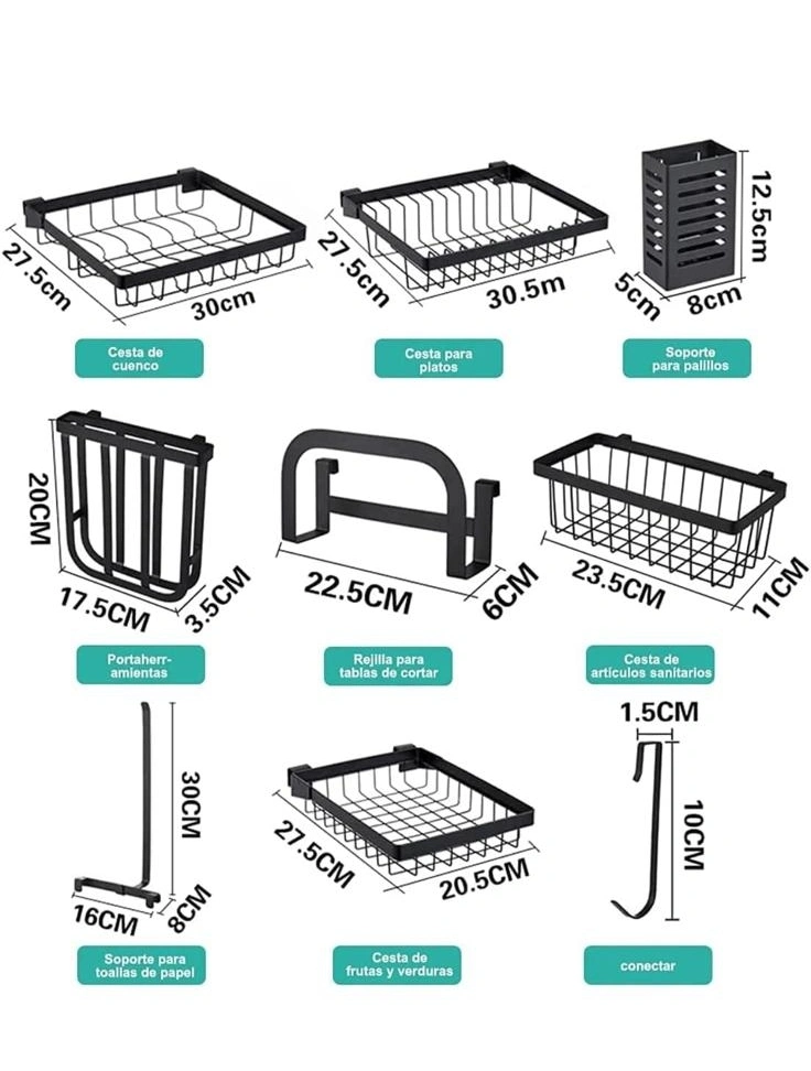 Black metal dish drying rack. Multiple compartments and hooks. Suitable for over-the-sink installation. Includes various sized baskets and caddies. Dimensions shown in images.