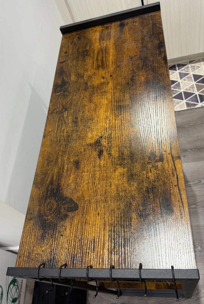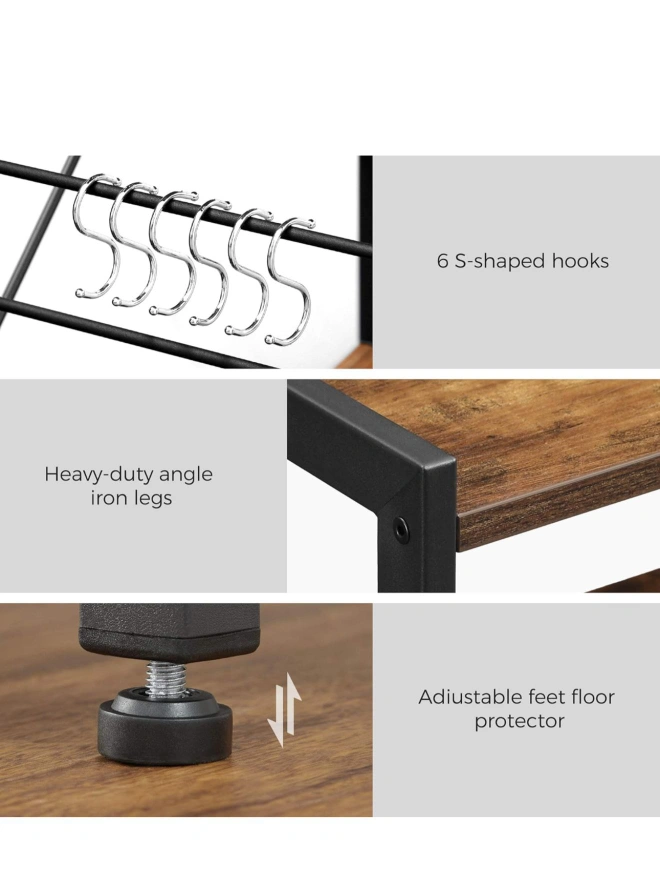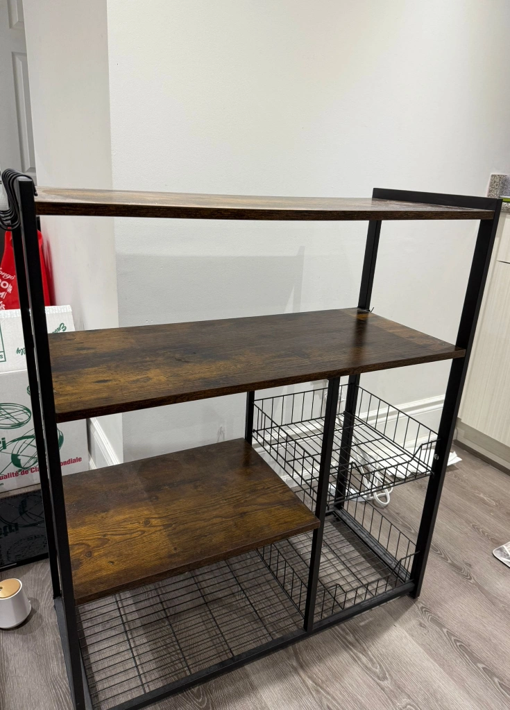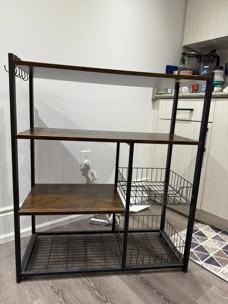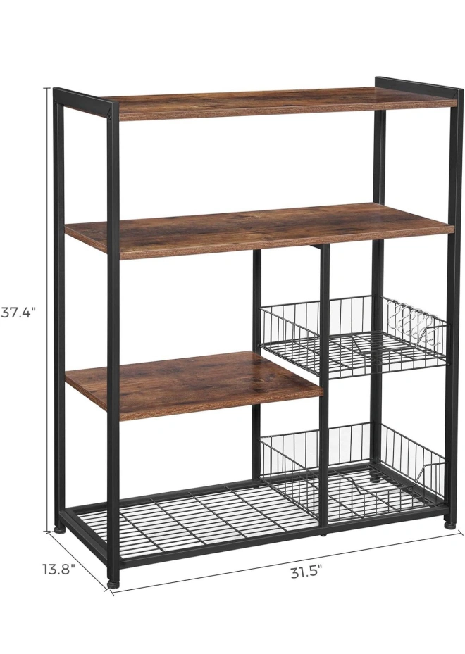 Four-tiered shelving unit. Features wire baskets and hooks. Metal frame, brown wood shelves. Great for kitchen storage.