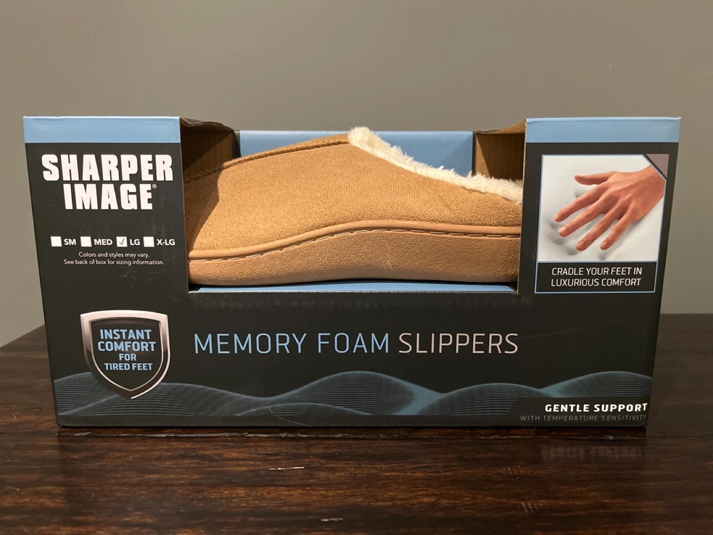 New in box. Memory foam slippers. Ultra-soft fabric cover with reinforced stitching. Flexible, non-skid construction. Temperature sensitive foam cradles your feet.