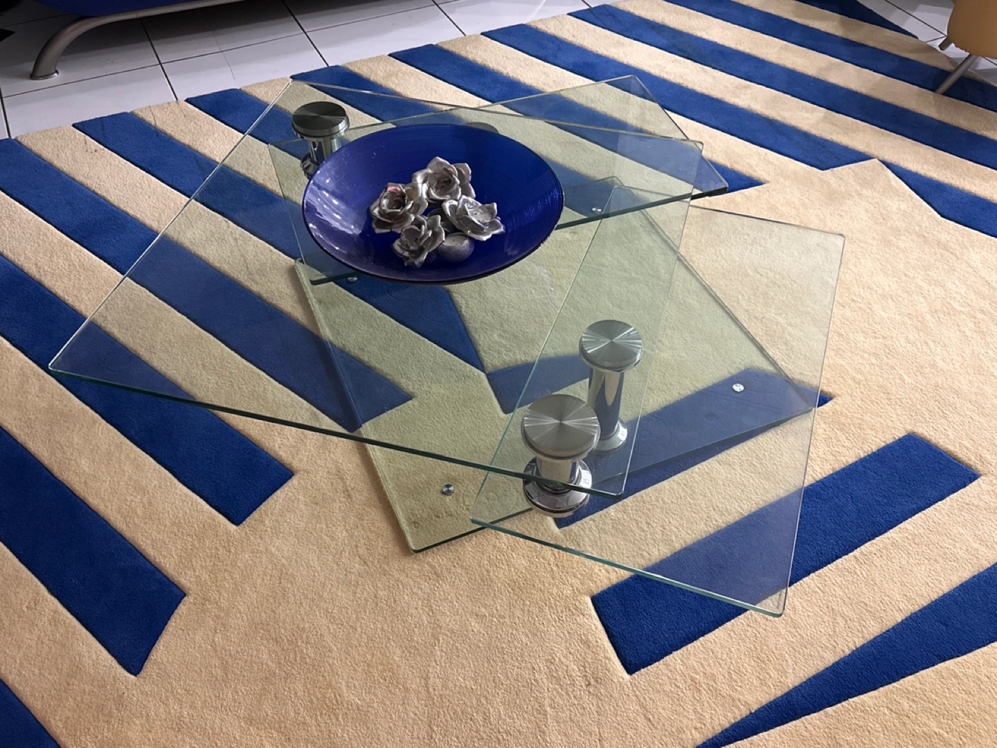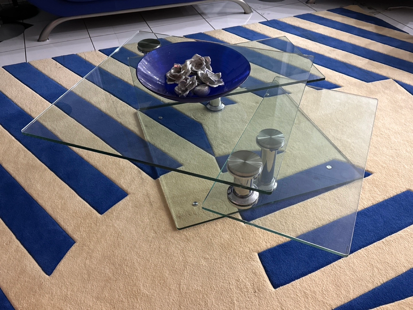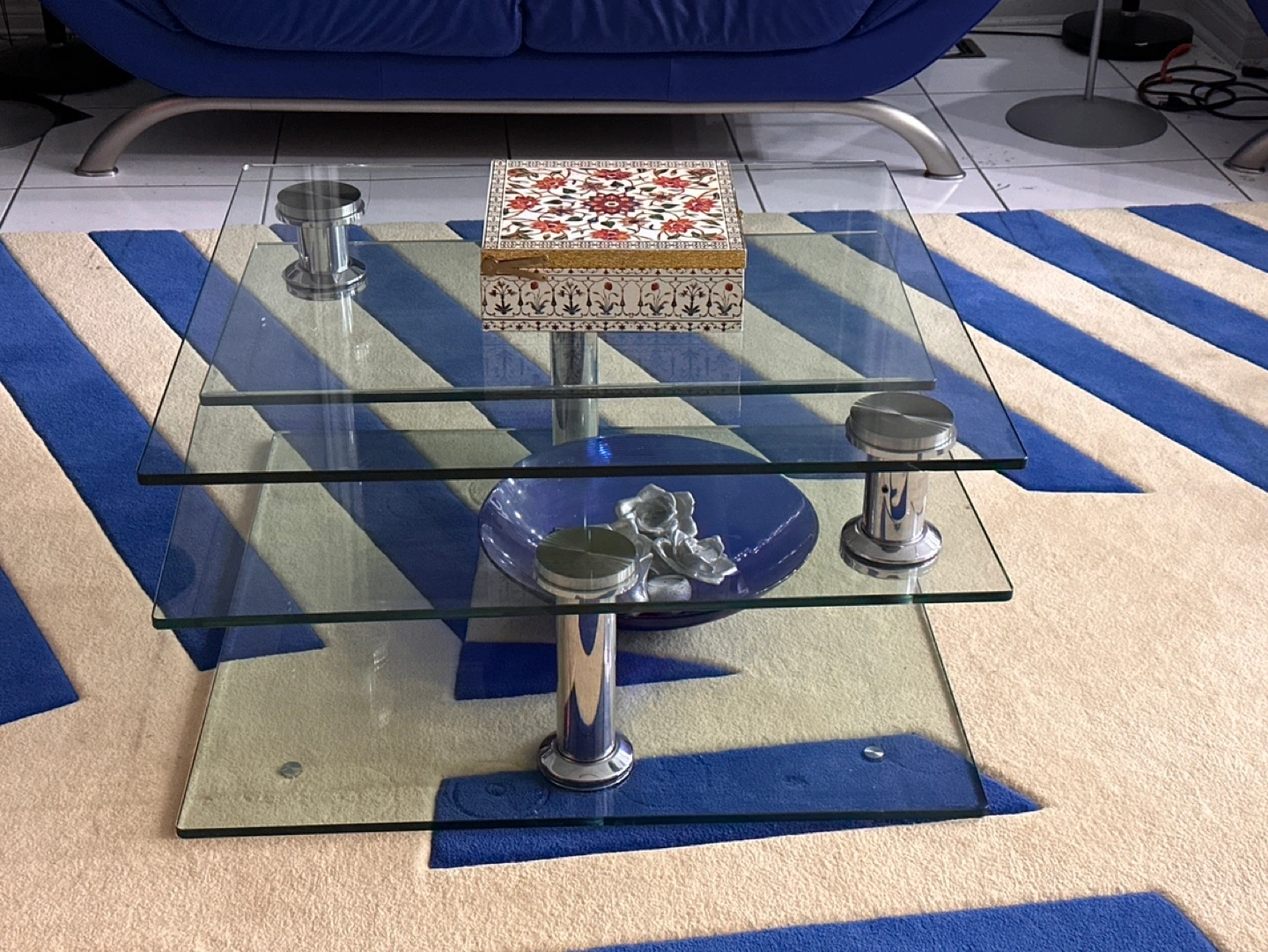 Three-tiered glass coffee table. Chrome metal supports. Contemporary design. Perfect for living room. Rotatable and extendable for more entertaining space.